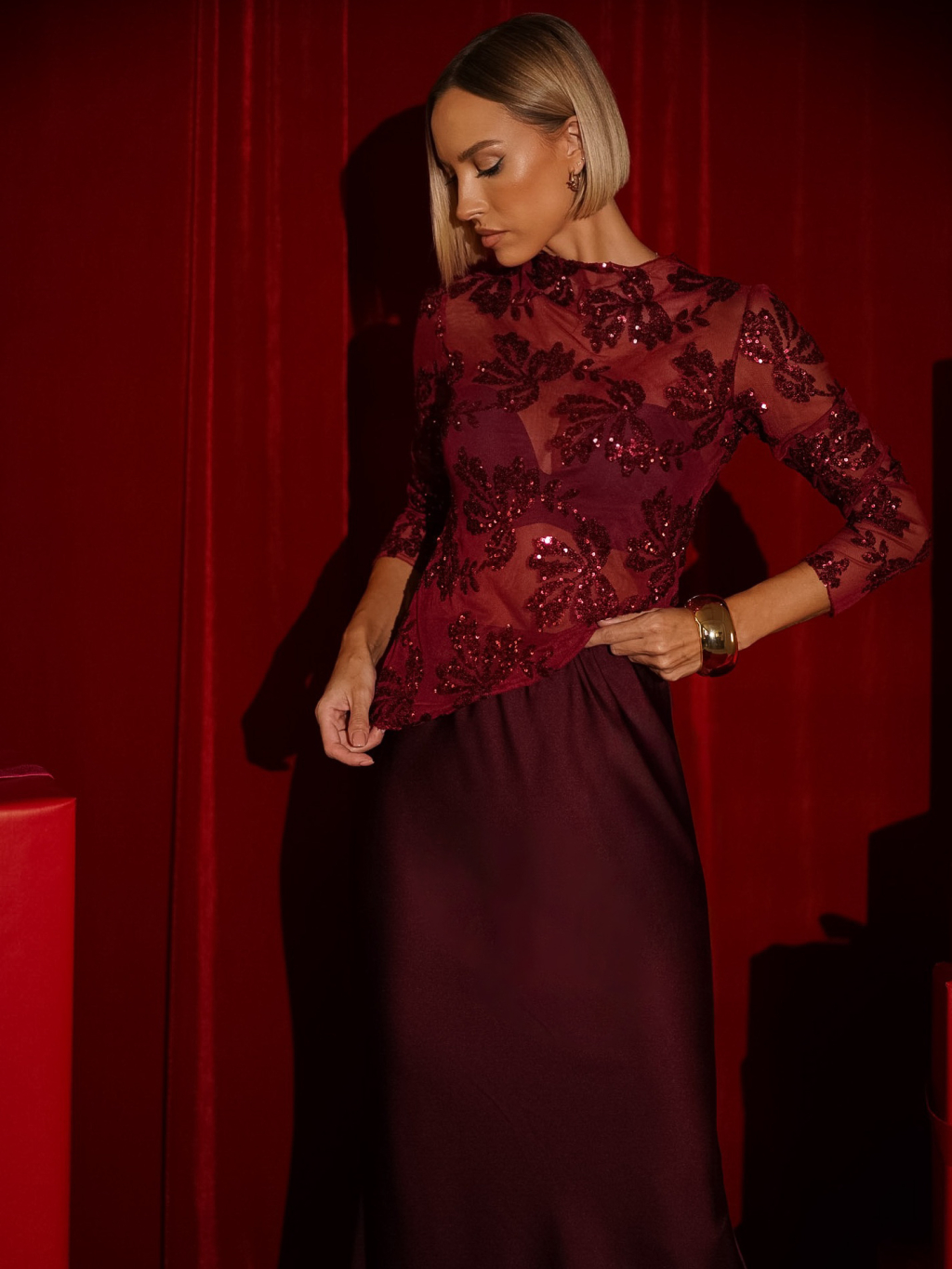 Bordó společenský třpytivý top QUASTEL s dlouhým rukávem