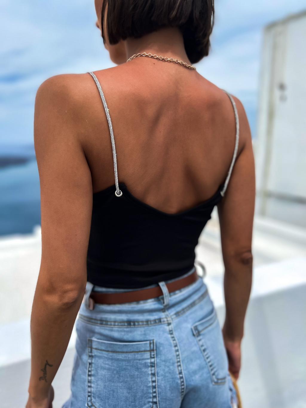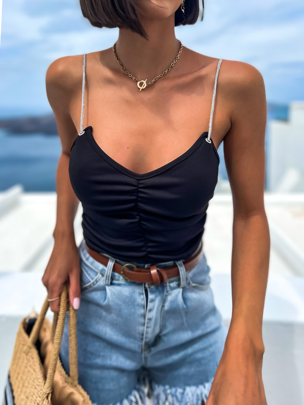 Černý elegantní crop top FRANCIES se třpytivými ramínky