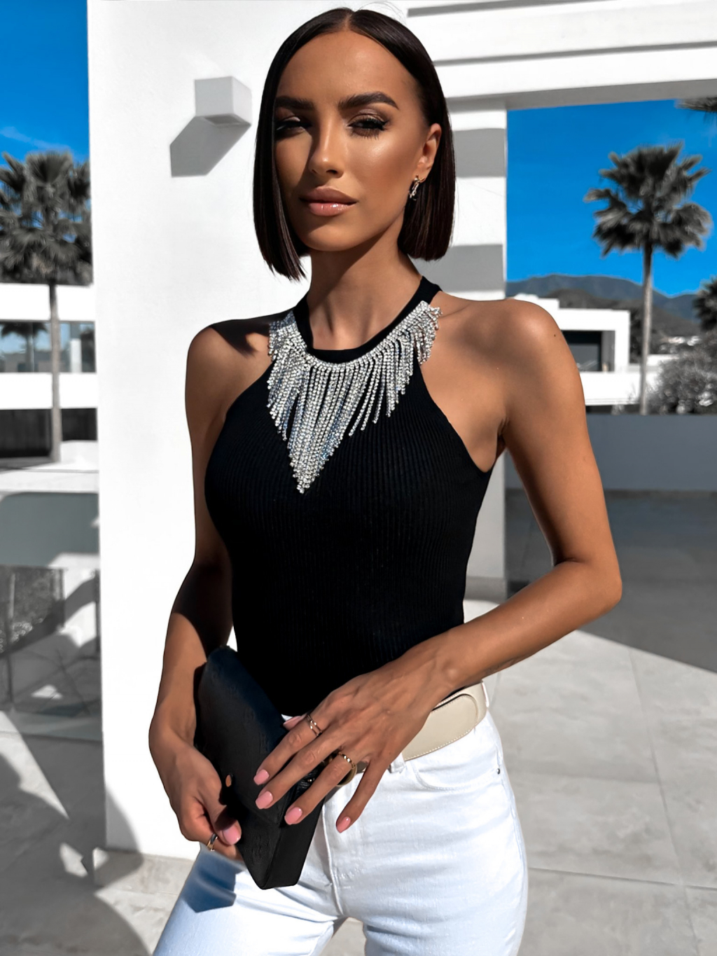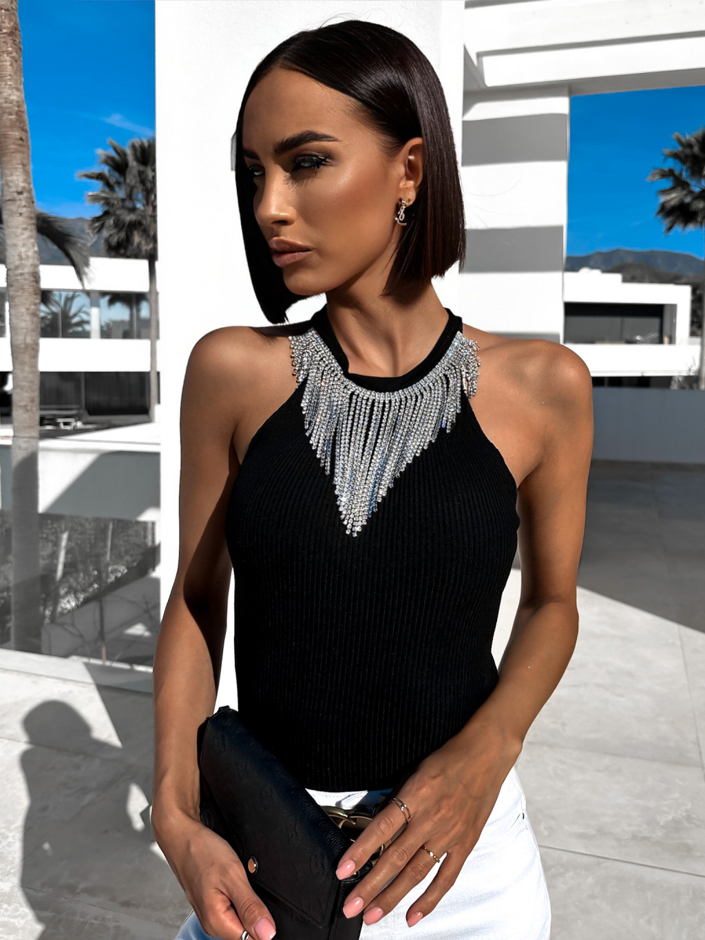 Černý elegantní top AROLENI se stříbrnými detaily