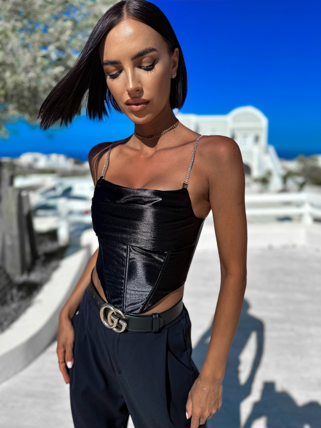 Černý lesklý elegantní top LUXERO se stříbrnými ramínky