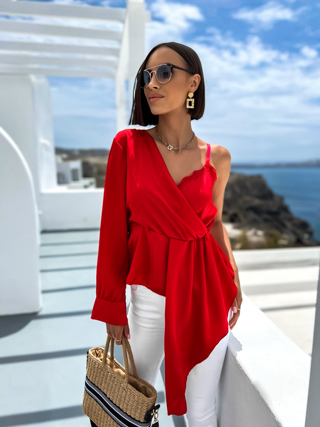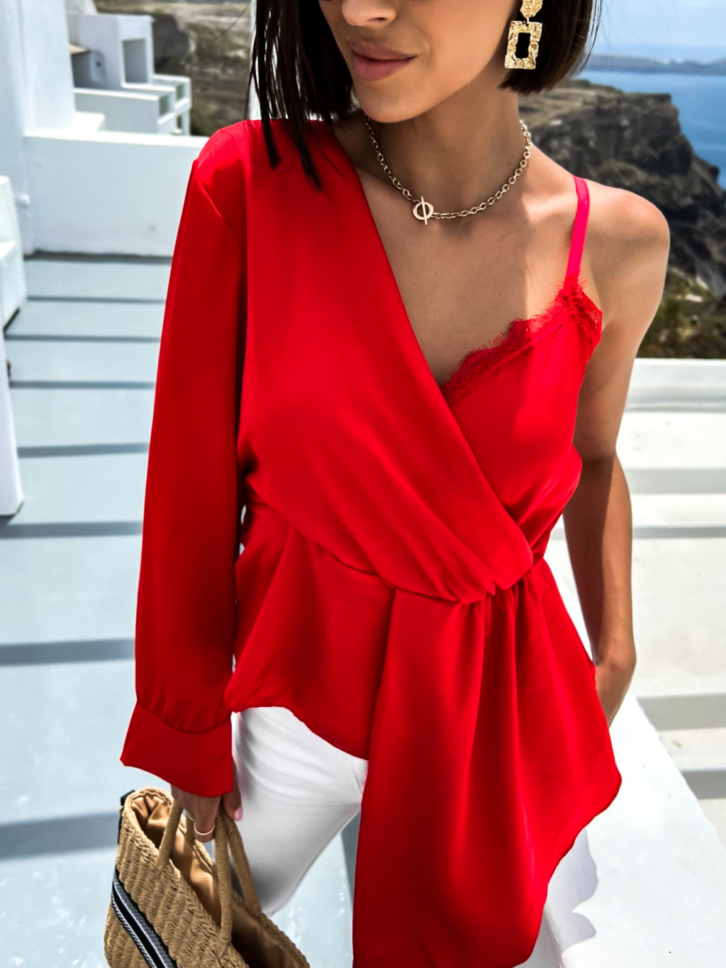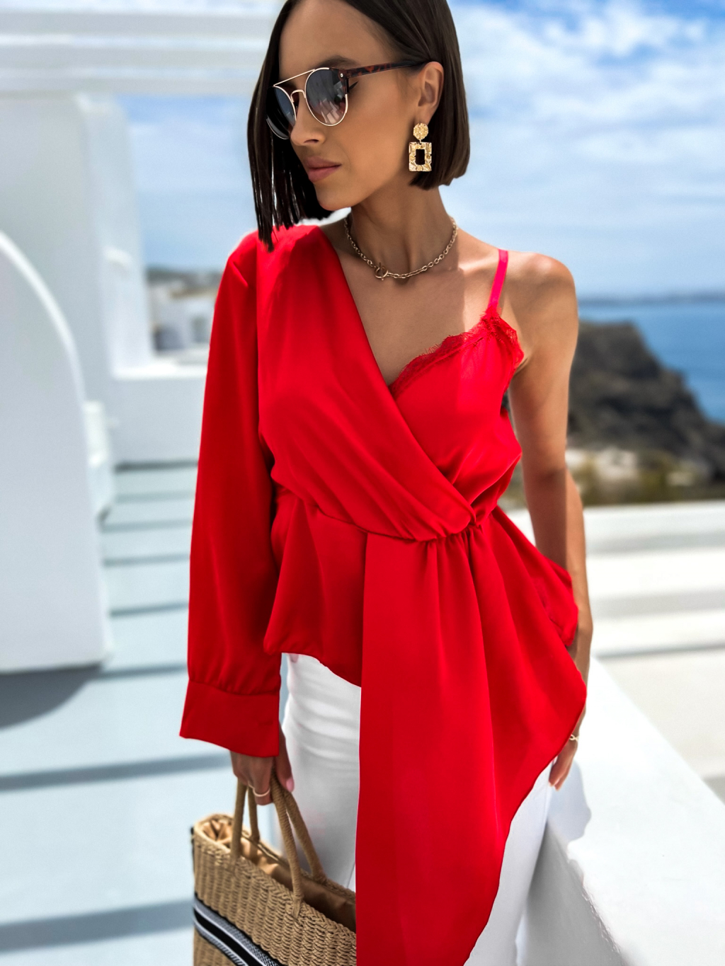 Červená lesklá halenka MADLYE s jedním dlouhým rukávem