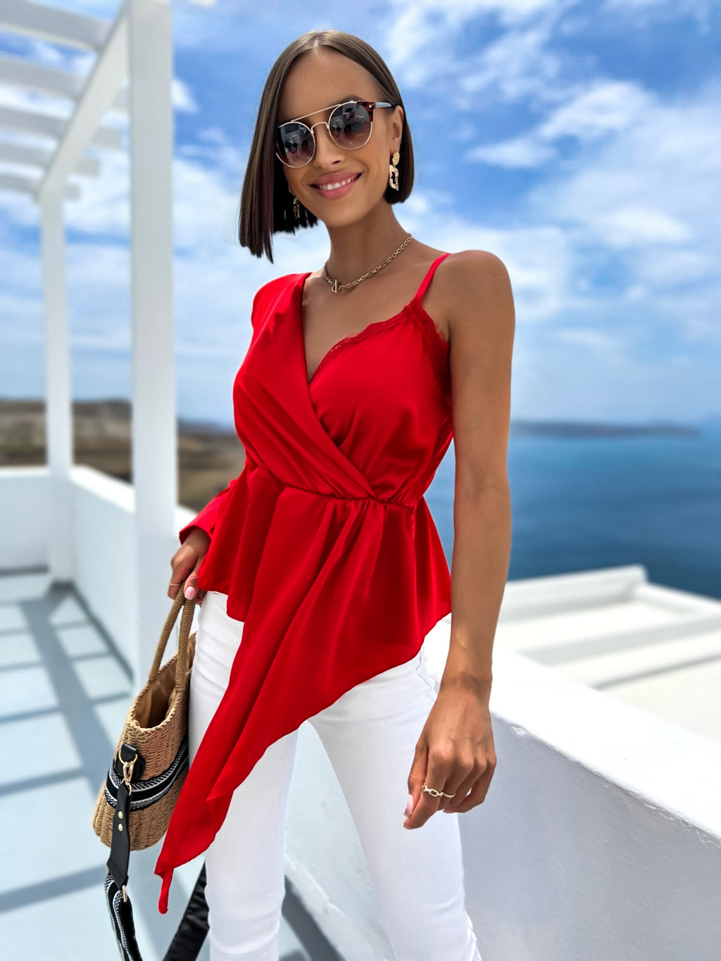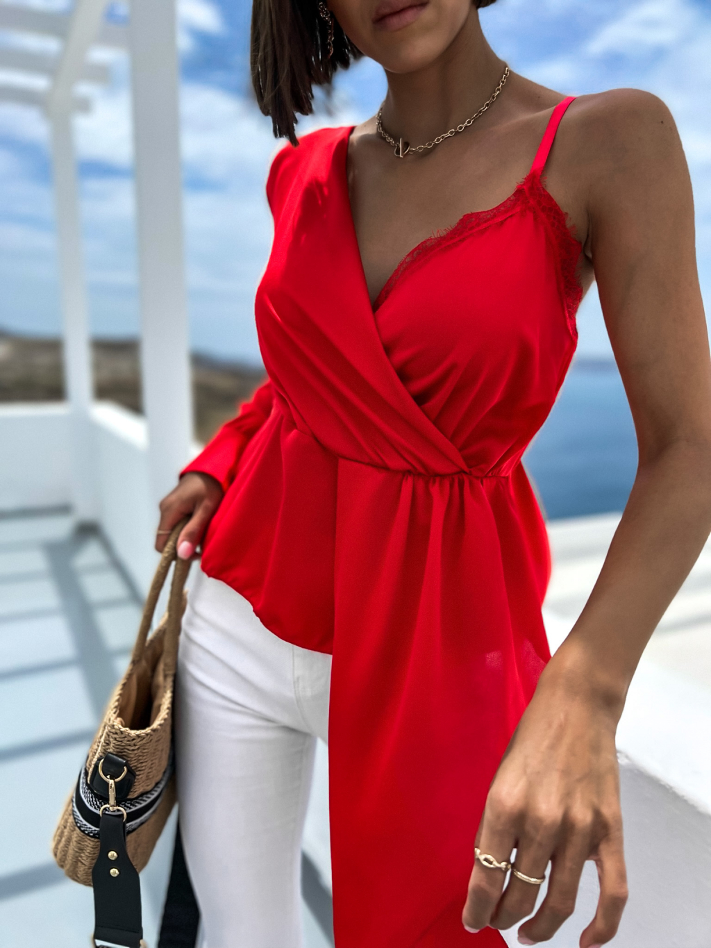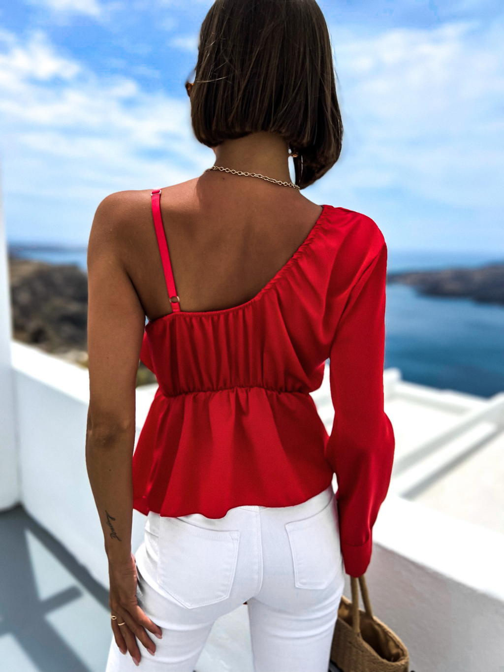 Červená lesklá halenka MADLYE s jedním dlouhým rukávem