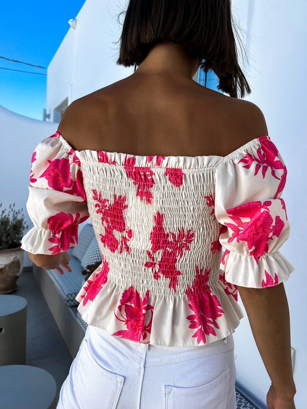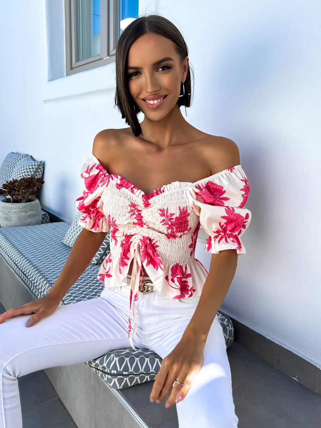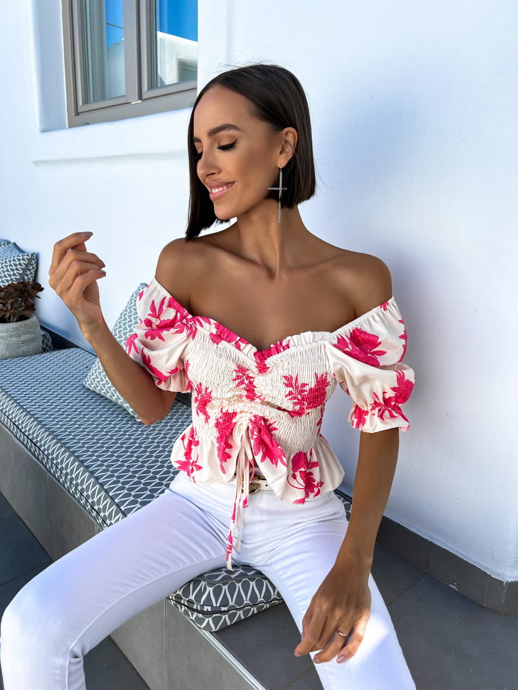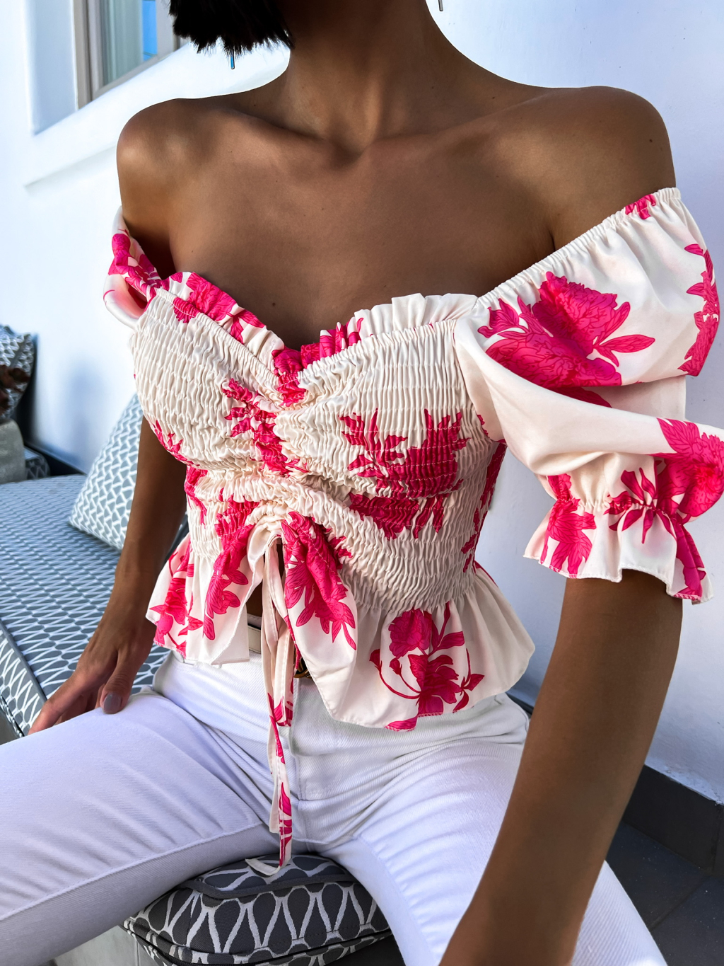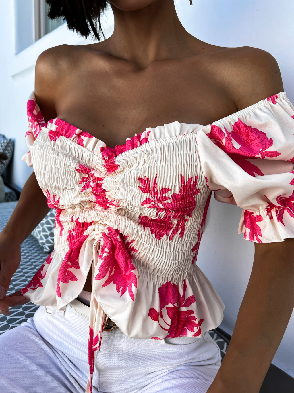 Růžový elegantní crop top AMARA s květinovým vzorem