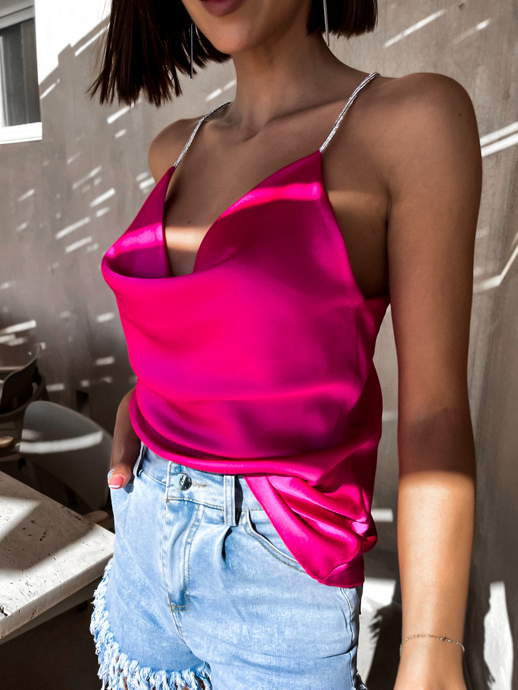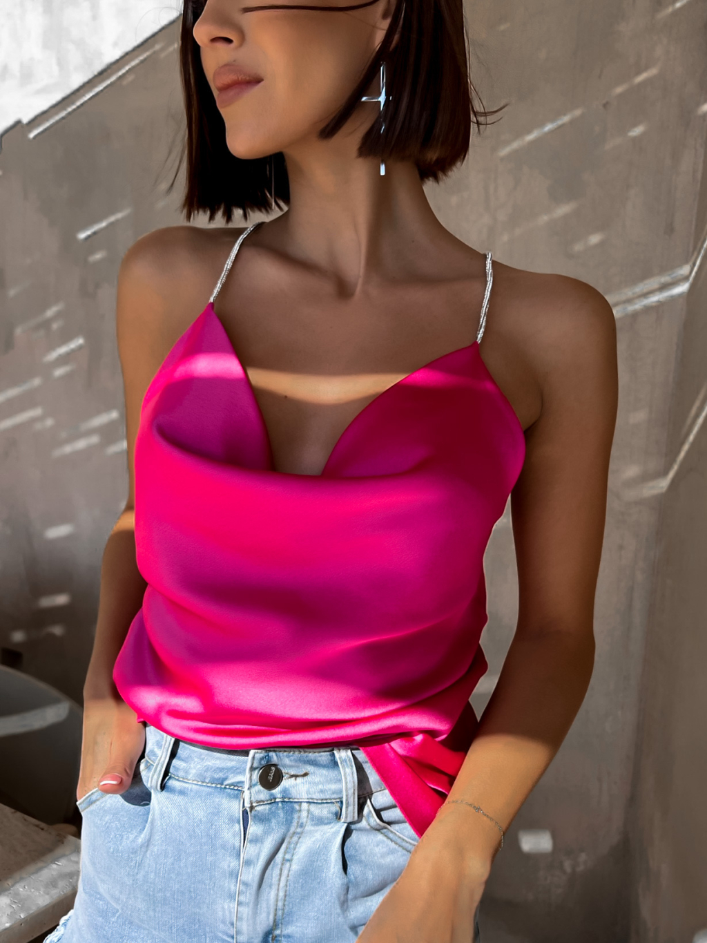 Růžový lesklý top PELLY se třpytivými ramínky