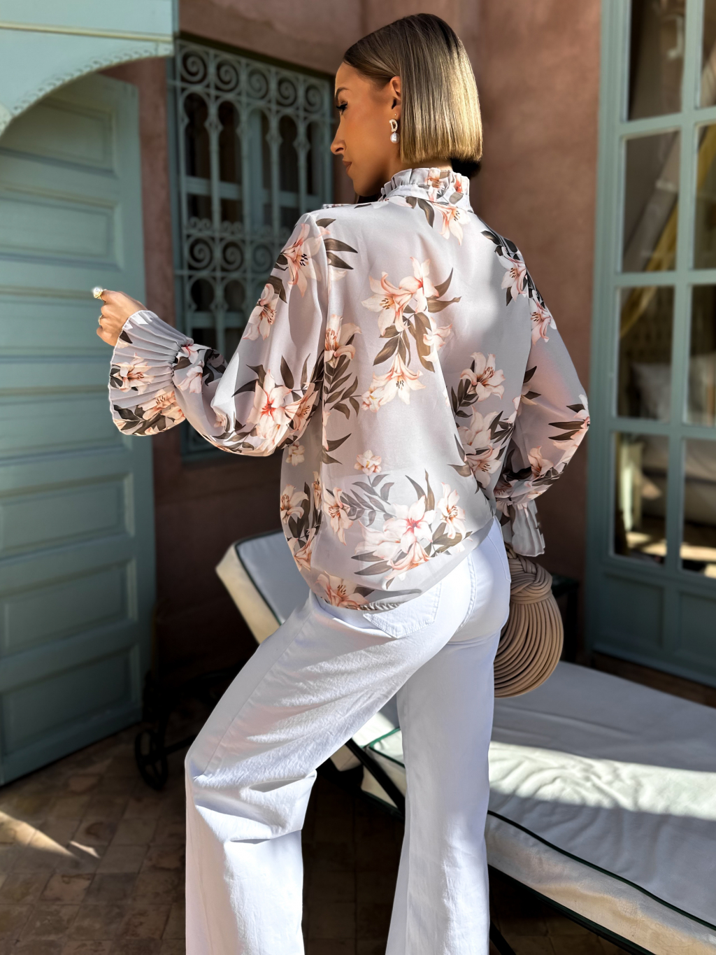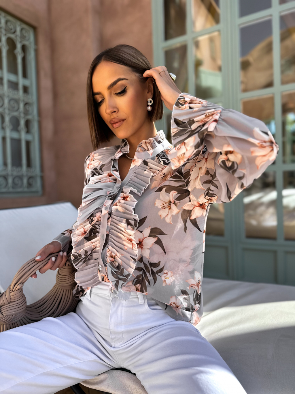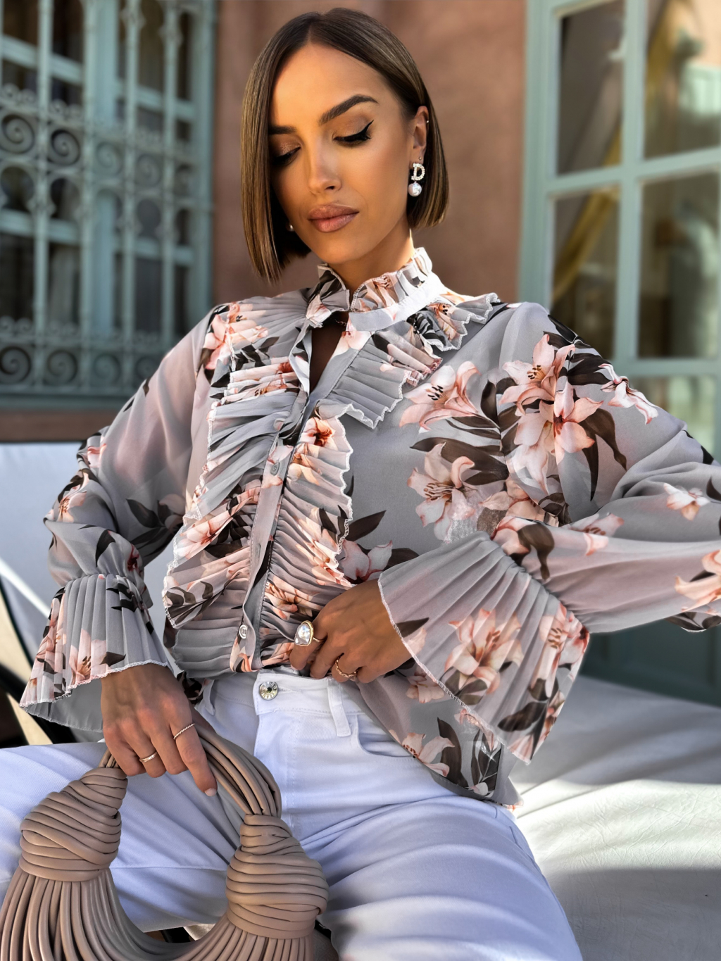 Šedá květinová halenka GINO s volány
