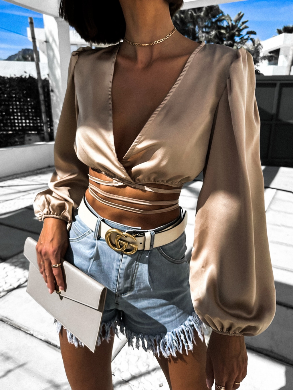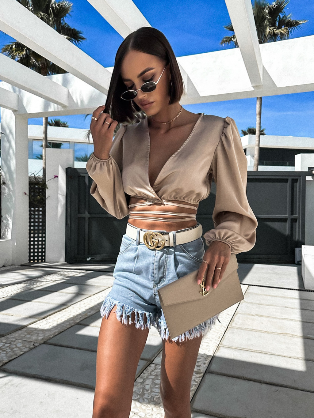 Světle hnědý elegantní crop top ROXIE na zavazování