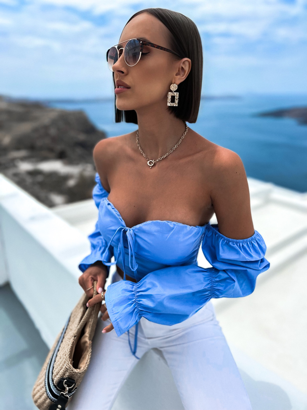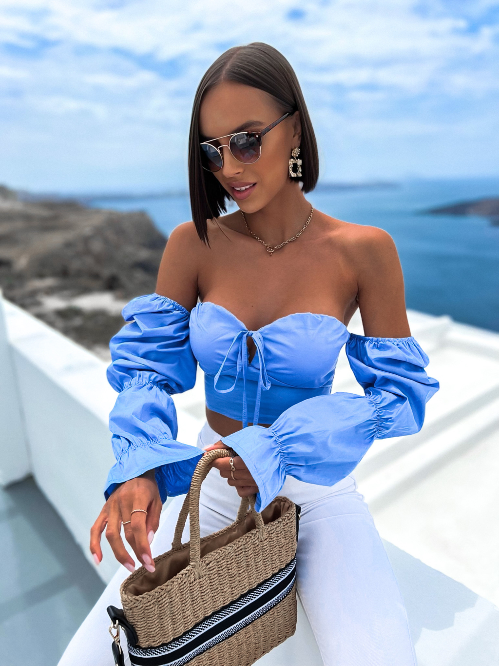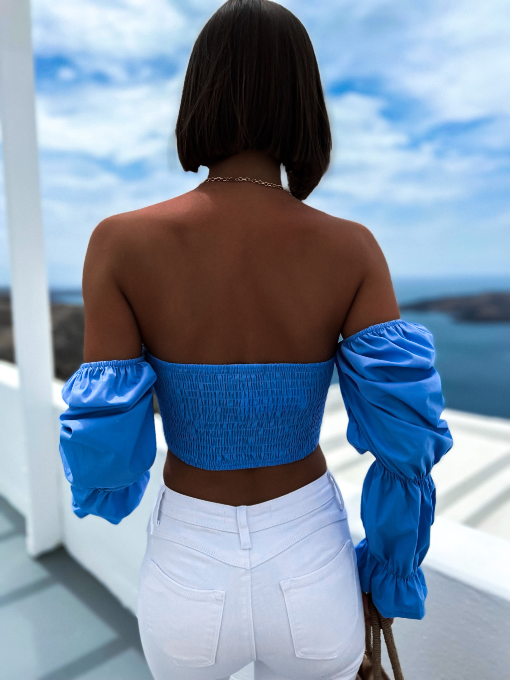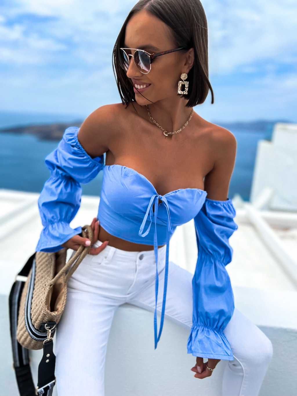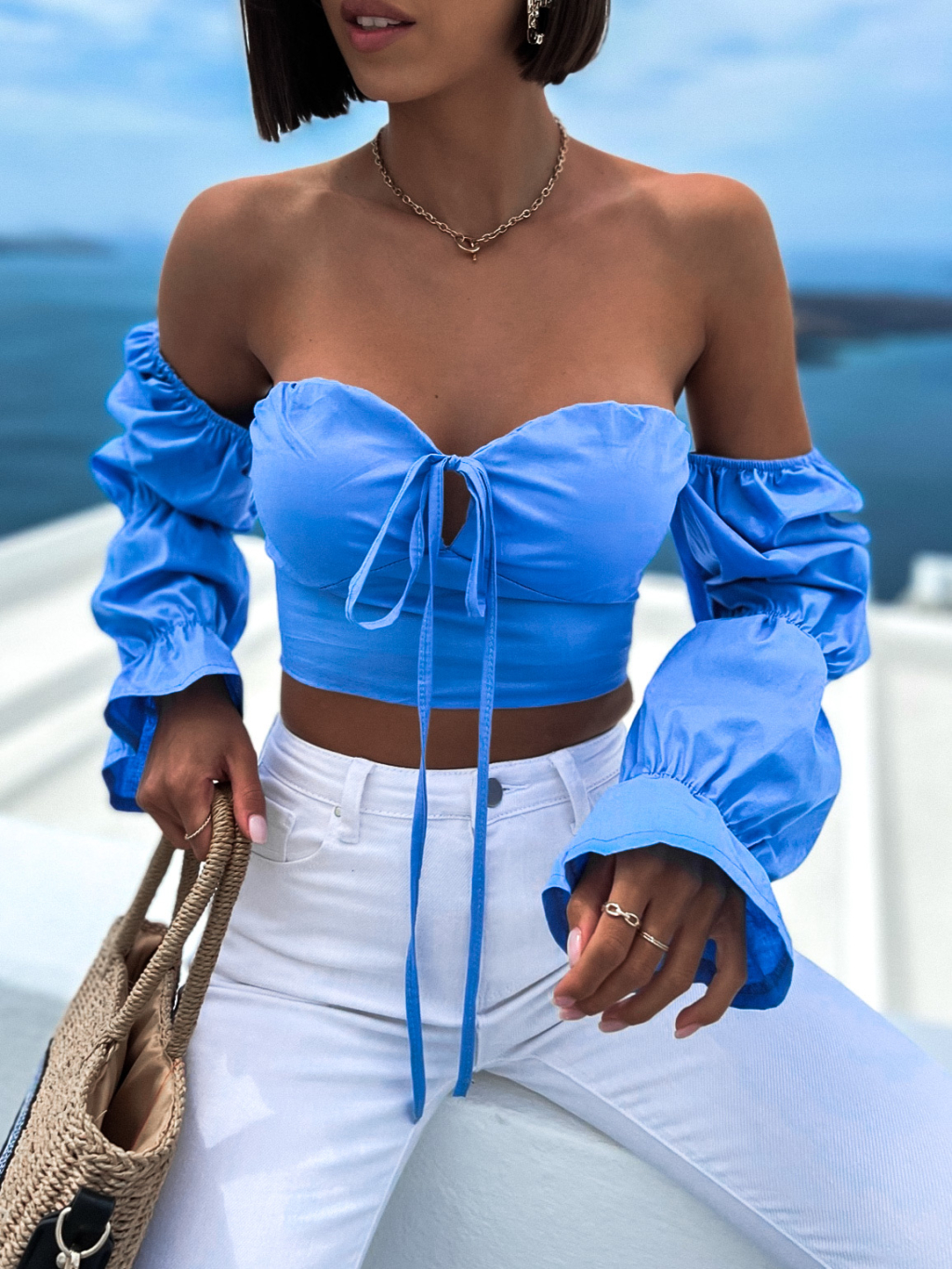 Světle modrý elegantní crop top CORCES s volánky
