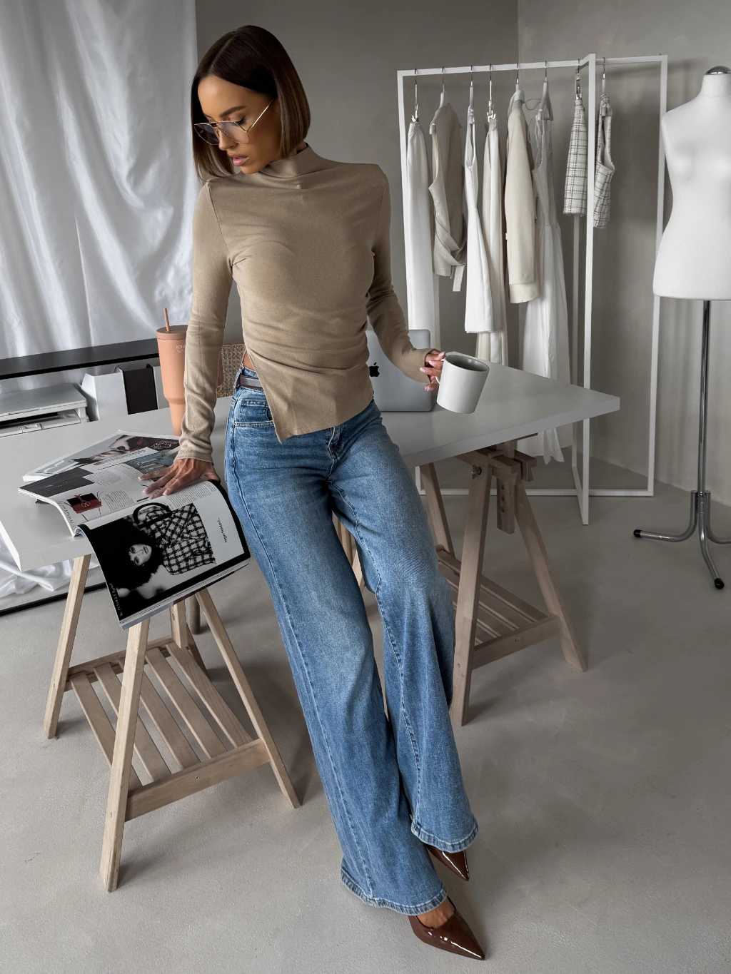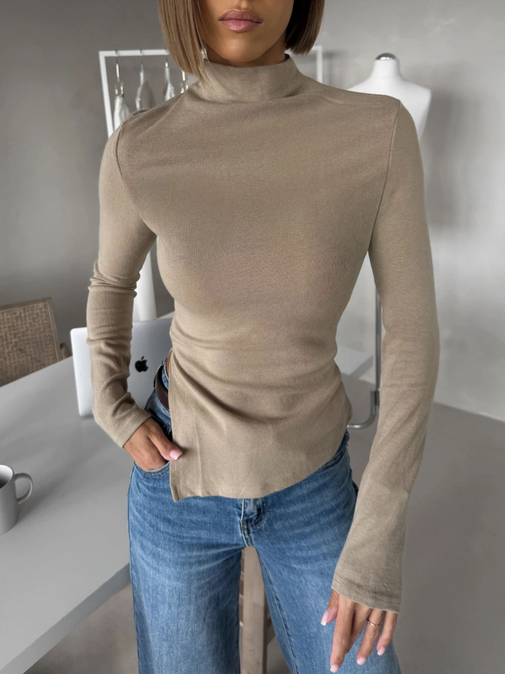 Béžové elegantní řasené triko HOLLOW s dlouhým rukávem