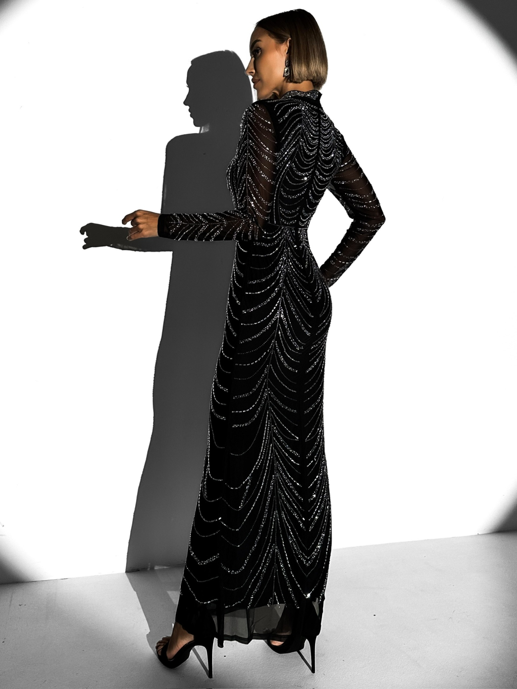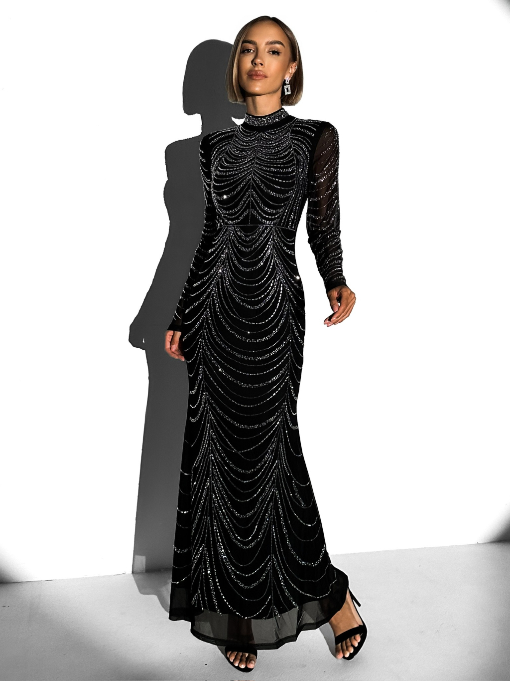 Černé třpytivé dlouhé šaty BISERKA s dlouhým rukávem
