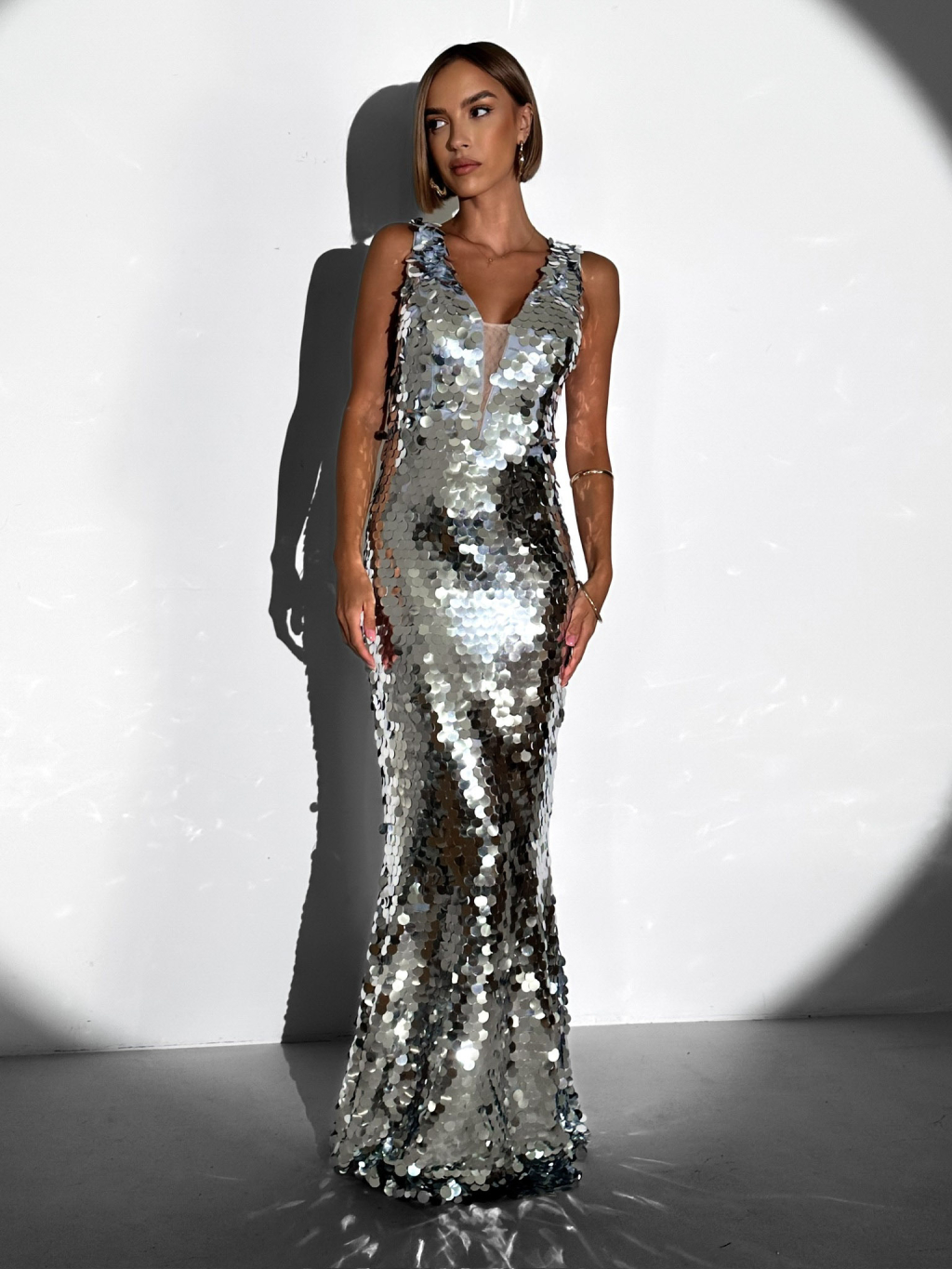 Stříbrné třpytivé dlouhé večerní šaty SYVAT