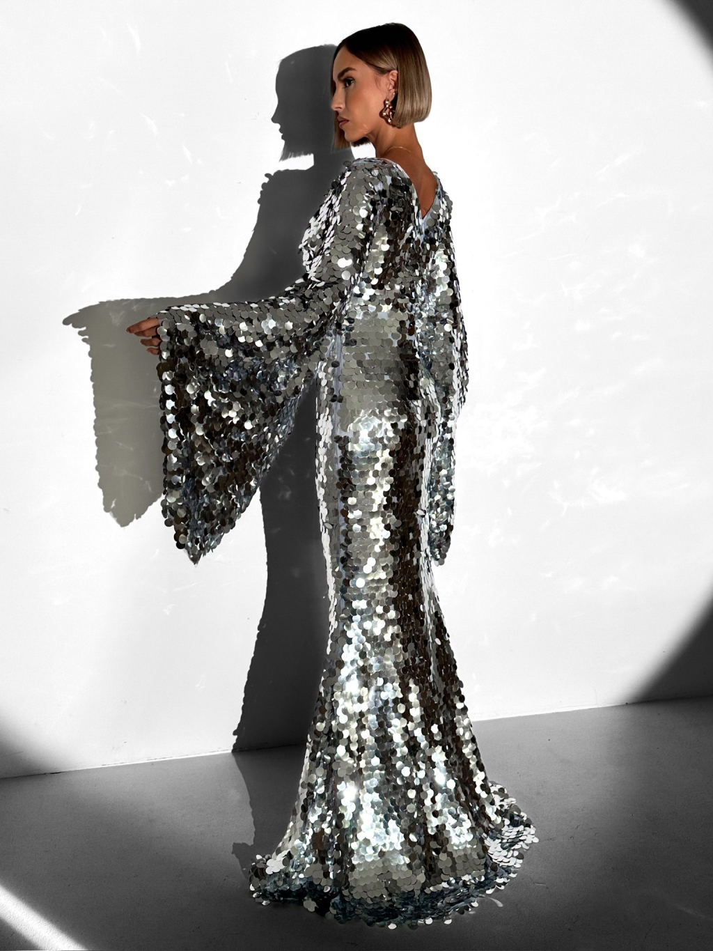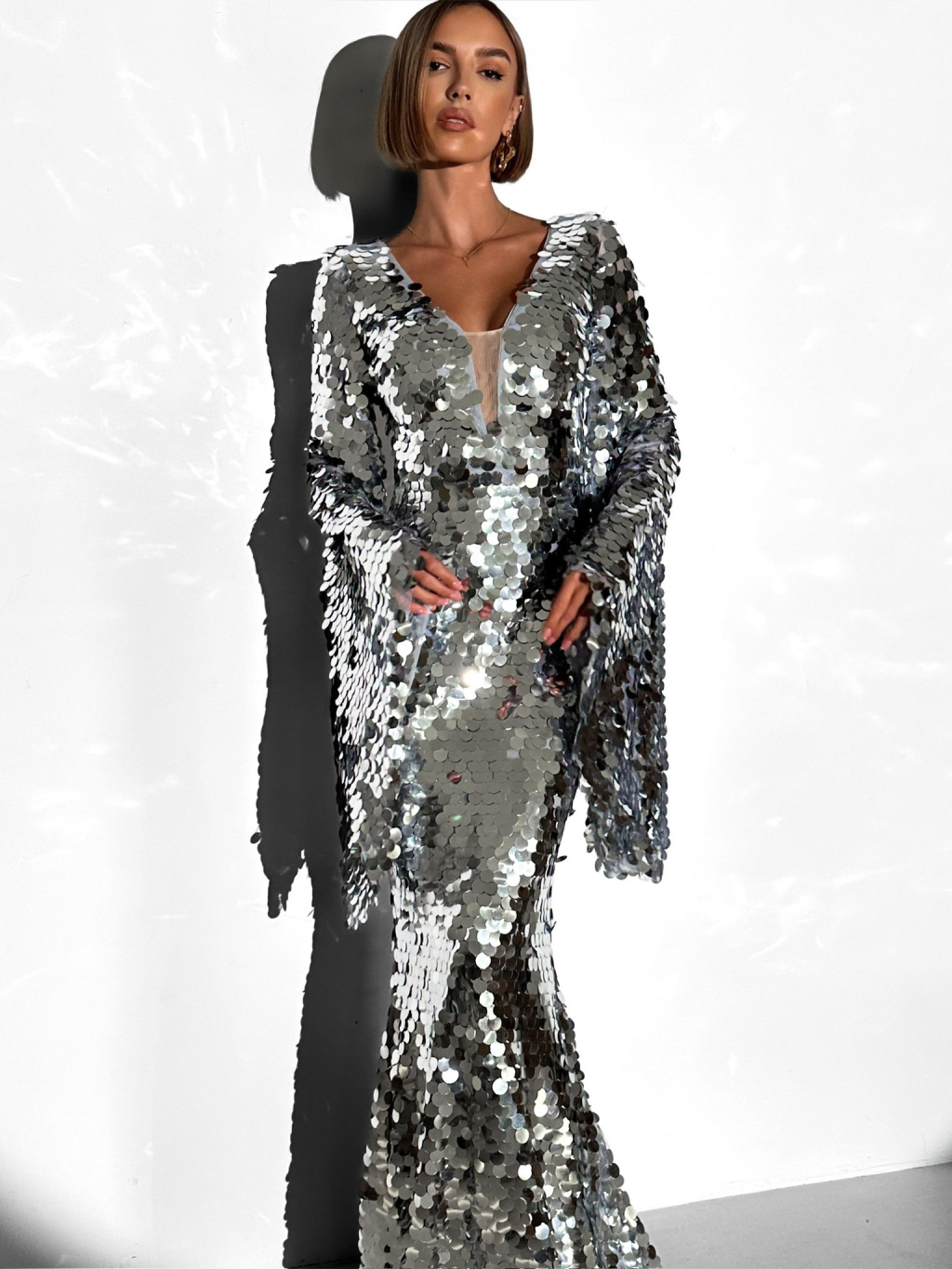 Stříbrné třpytivé flitrované šaty BORYS s dlouhým rukávem
