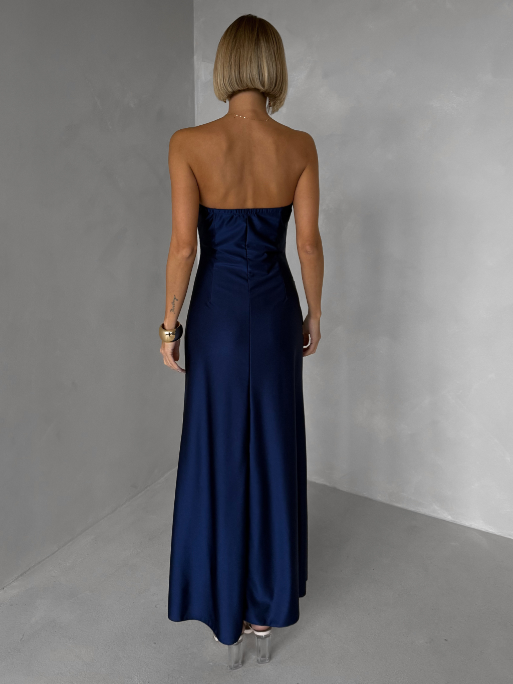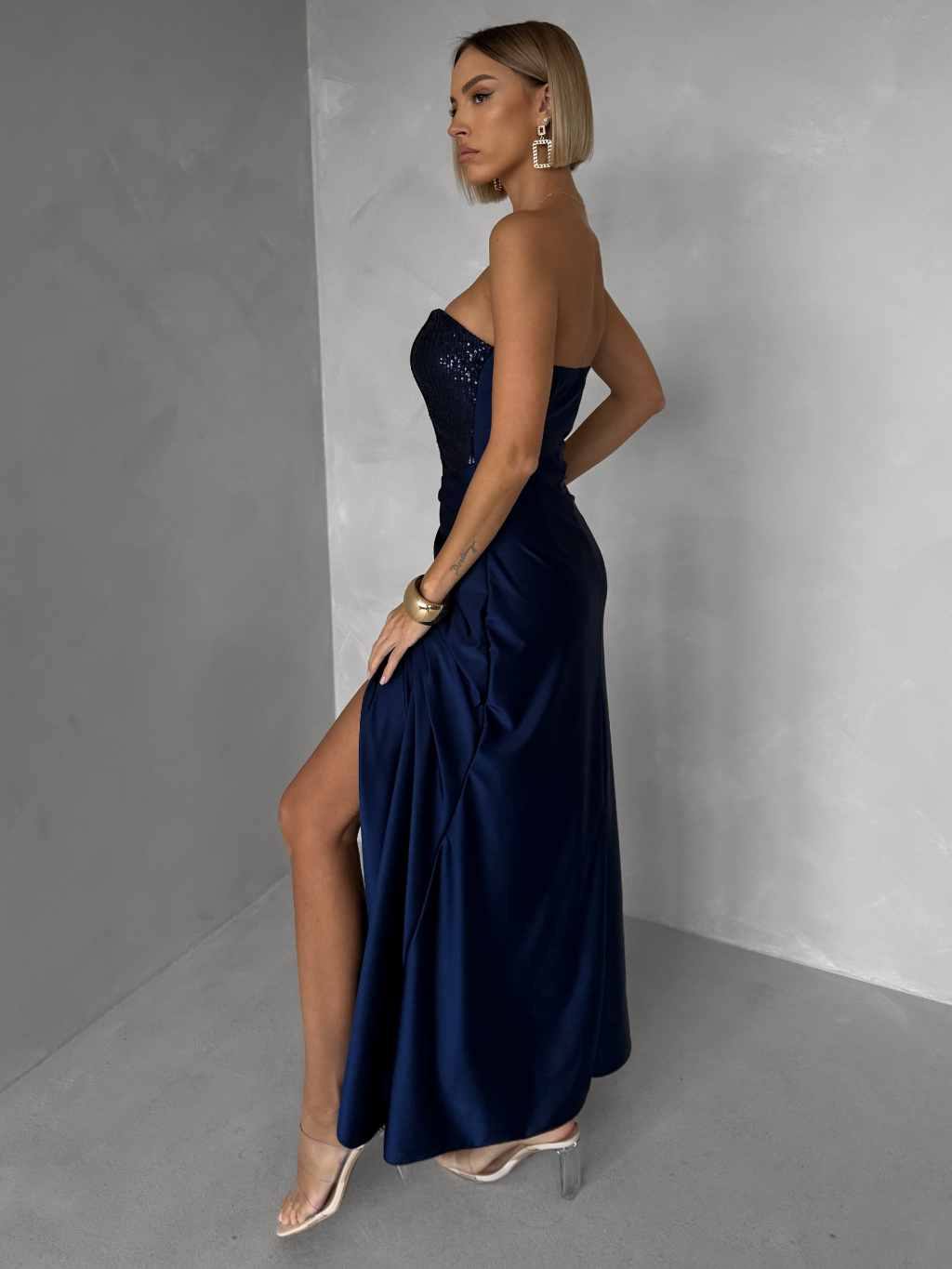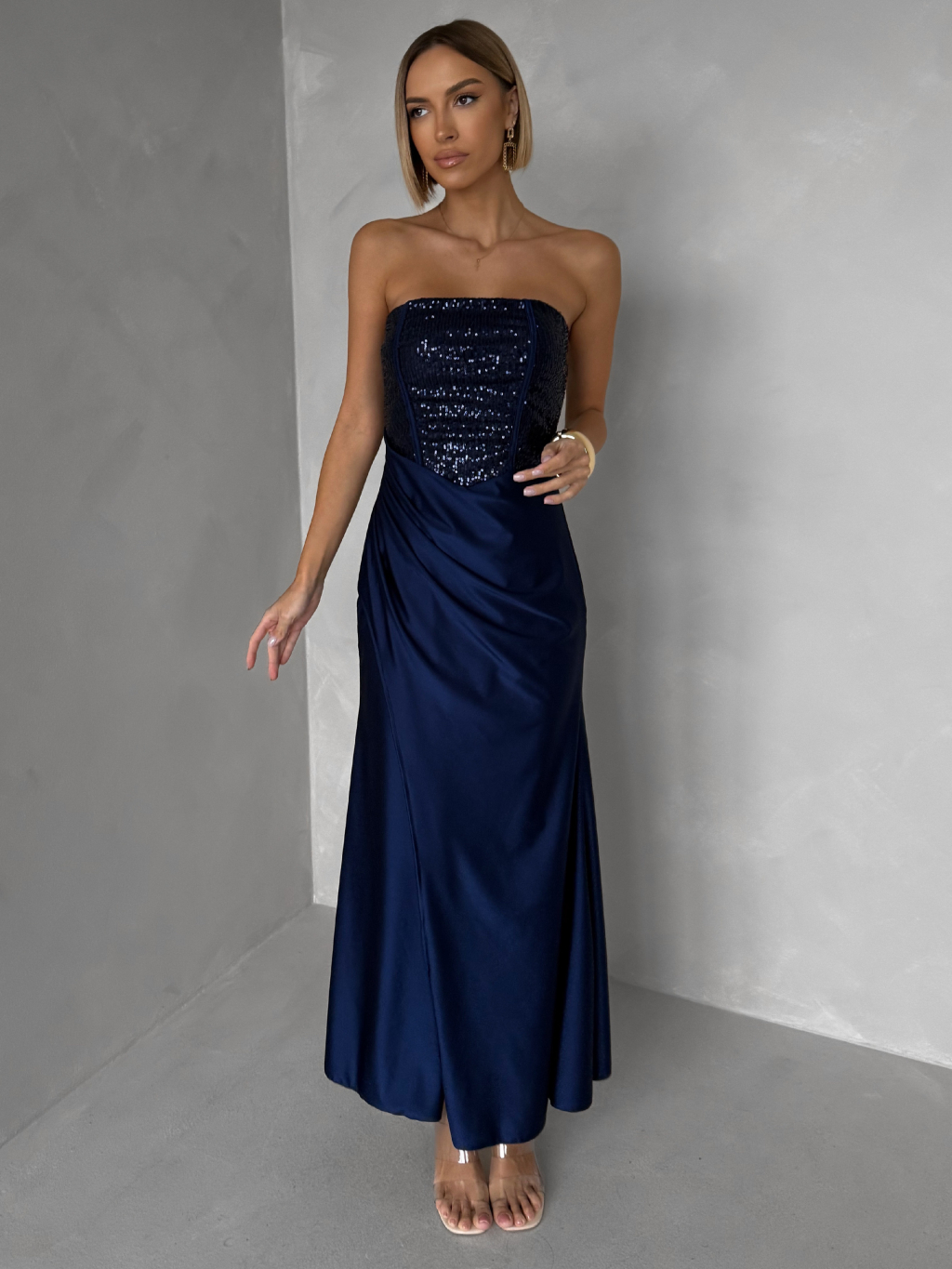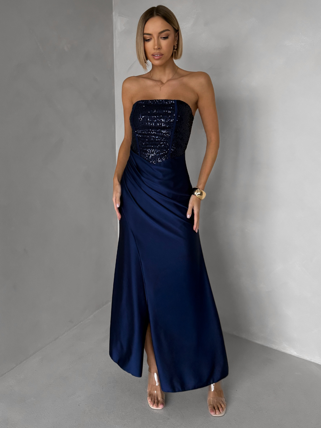 Tmavě modré třpytivé korzetové společenské šaty AVENZA s rozparkem