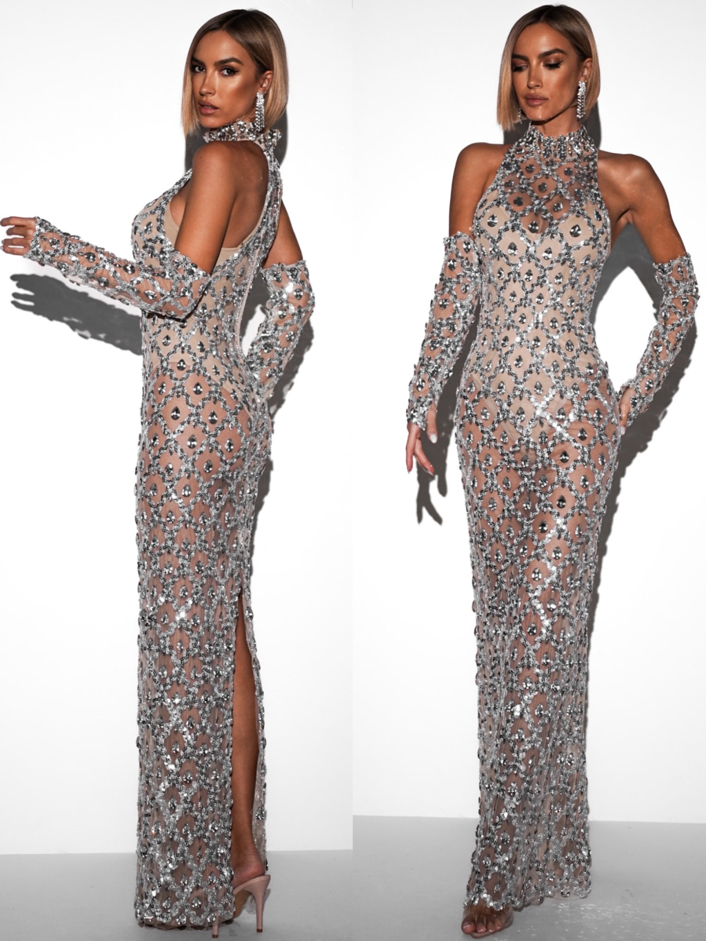 Třpytivé luxusní večerní šaty HAUTE s návleky a kamínky