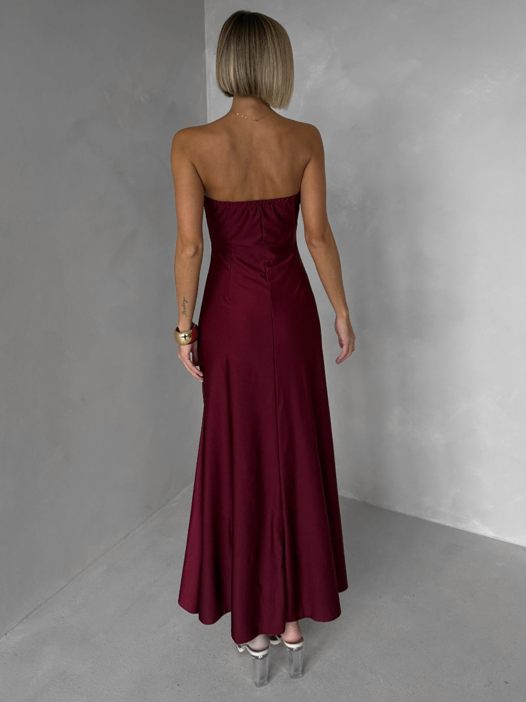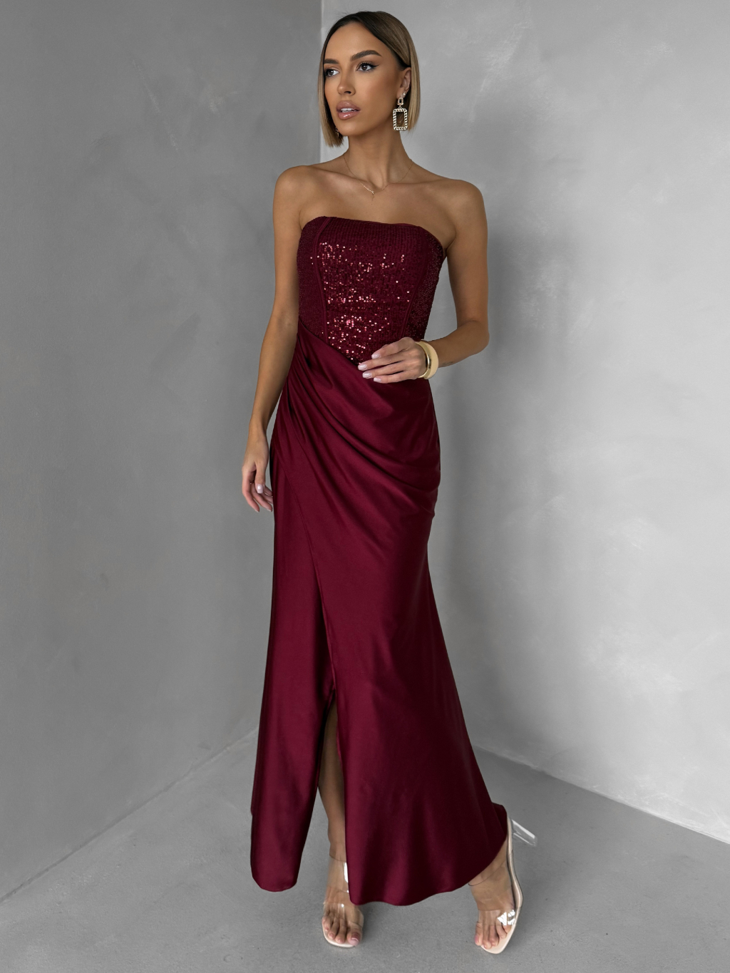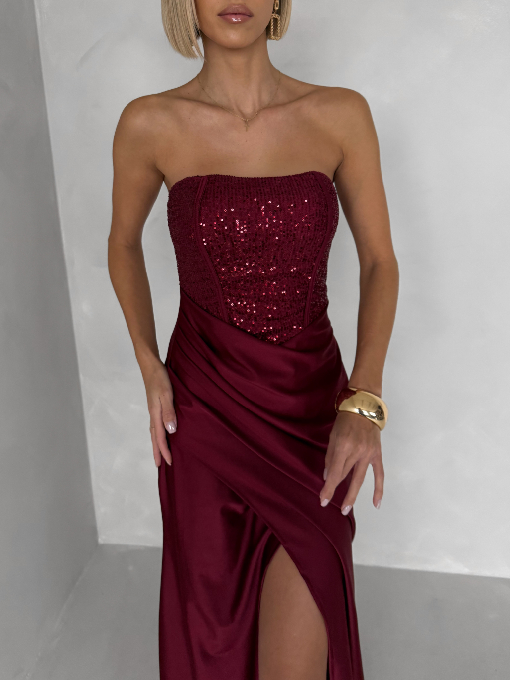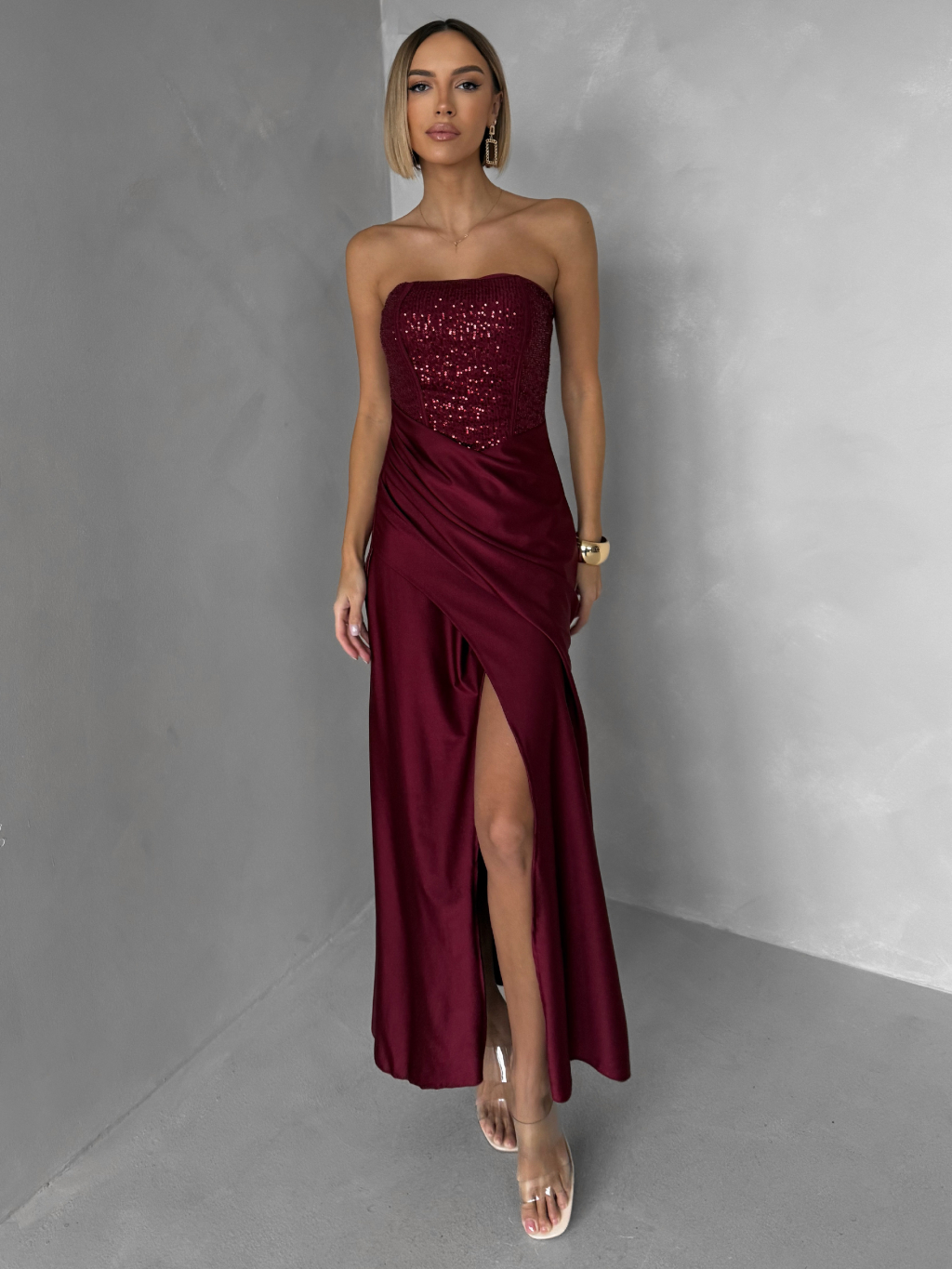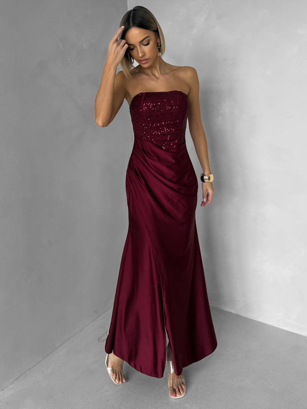 Vínové třpytivé korzetové společenské šaty AVENZA s rozparkem