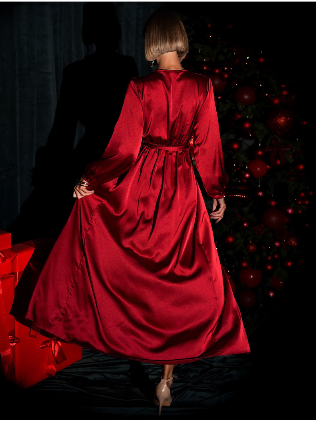 Bordó vánoční saténové šaty WOMAN s dlouhým rukávem