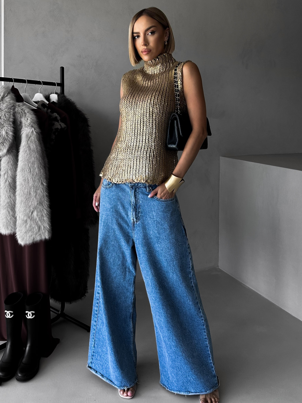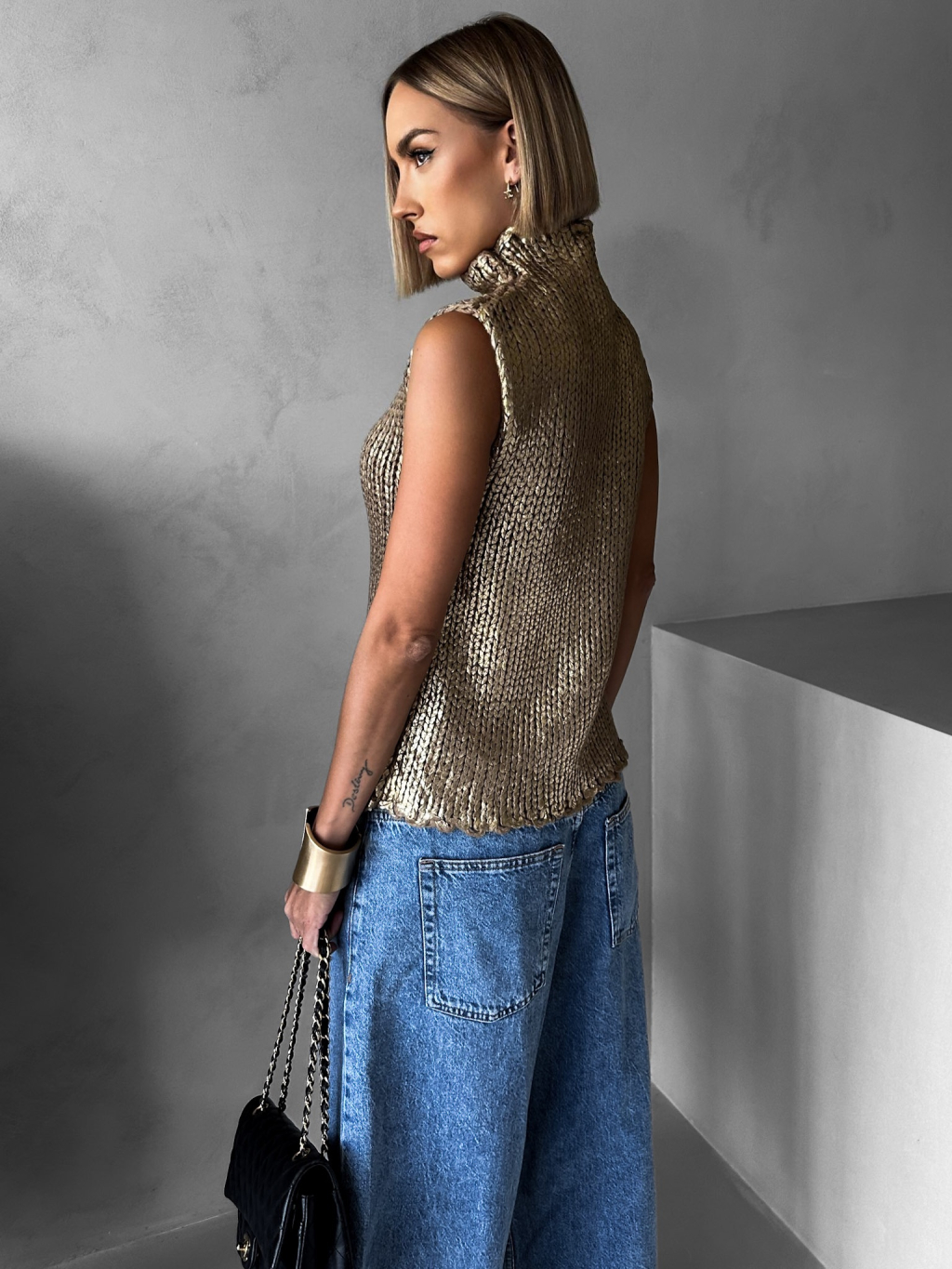 Zlatý metalický svetr bez rukávů MINJA