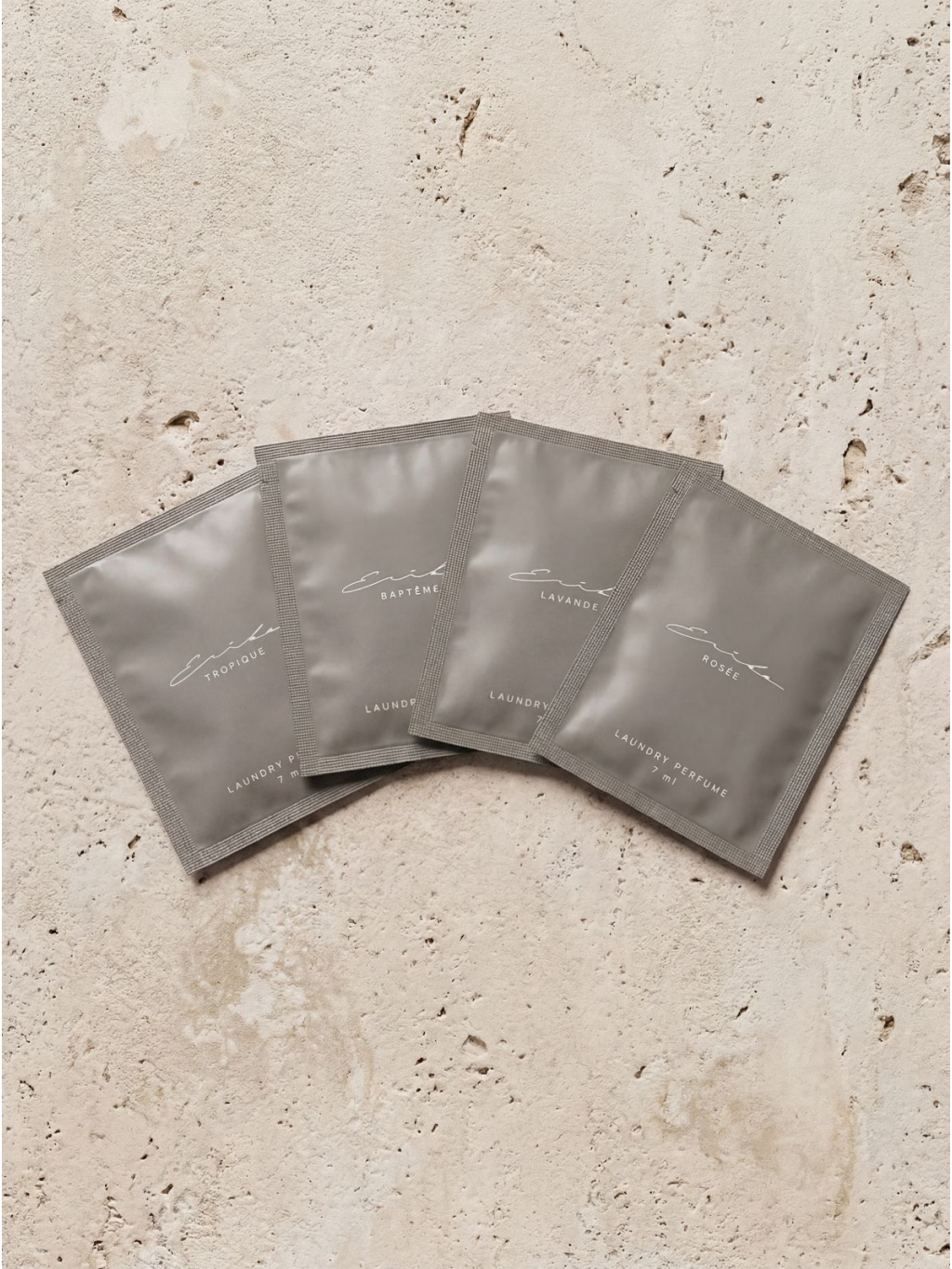 Zkušební set vzorků parfémů na praní obsahuje všechny čtyři naše vůně: BAPTÊME, LAVANDÉE, ROSÉE a TROPIQÉE.