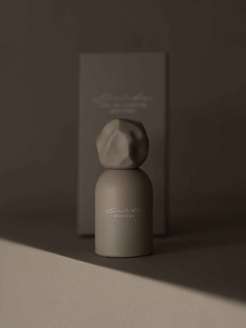 Flakon parfému je jedinečný, s víčkem ručně tvarovaným v duchu přírodního kamene. Jemné béžové sklo zvýrazňuje jeho charakter a odhaluje rovnováhu mezi čistotou, minimalismem a sofistikovanou krásou.