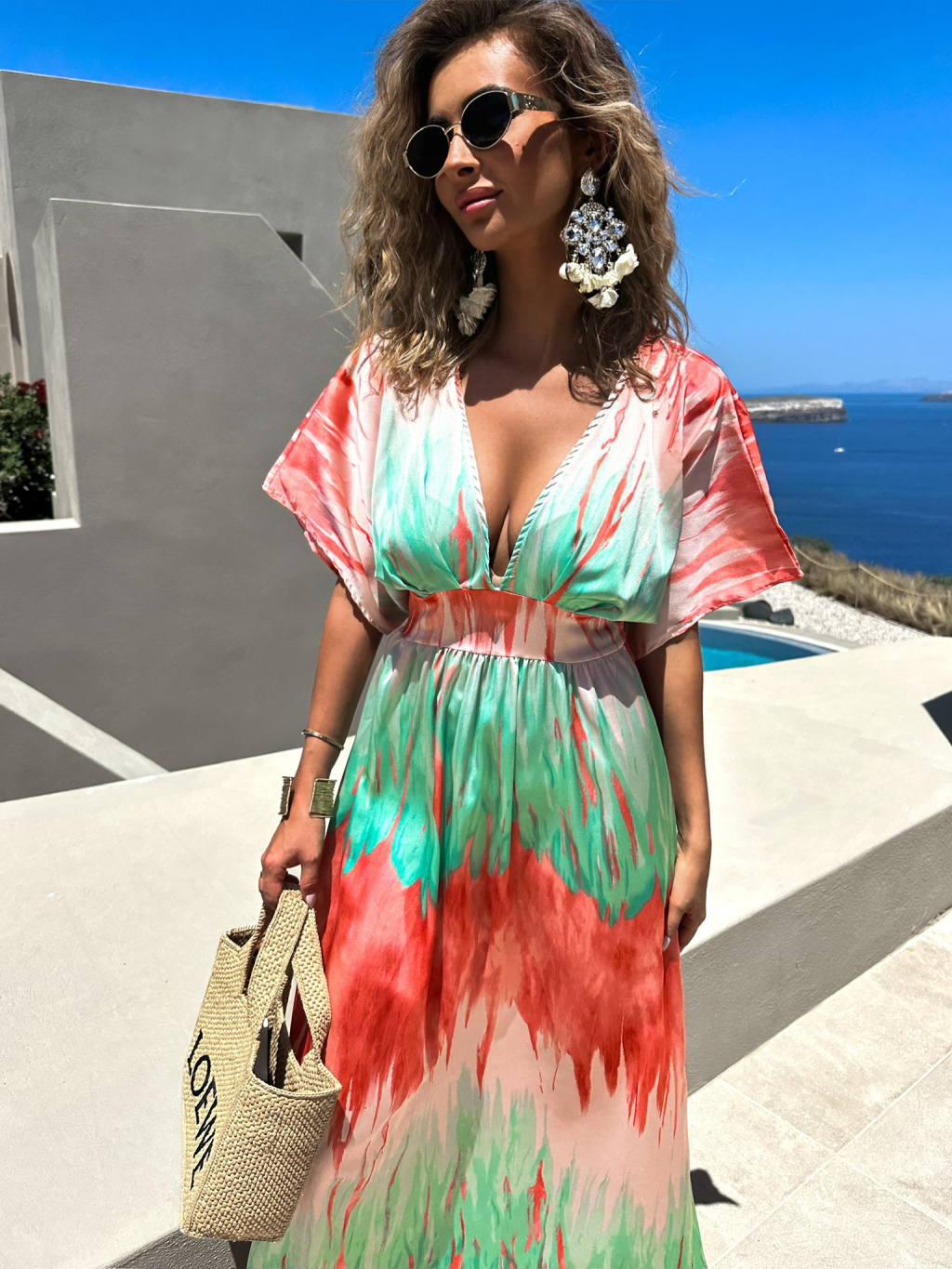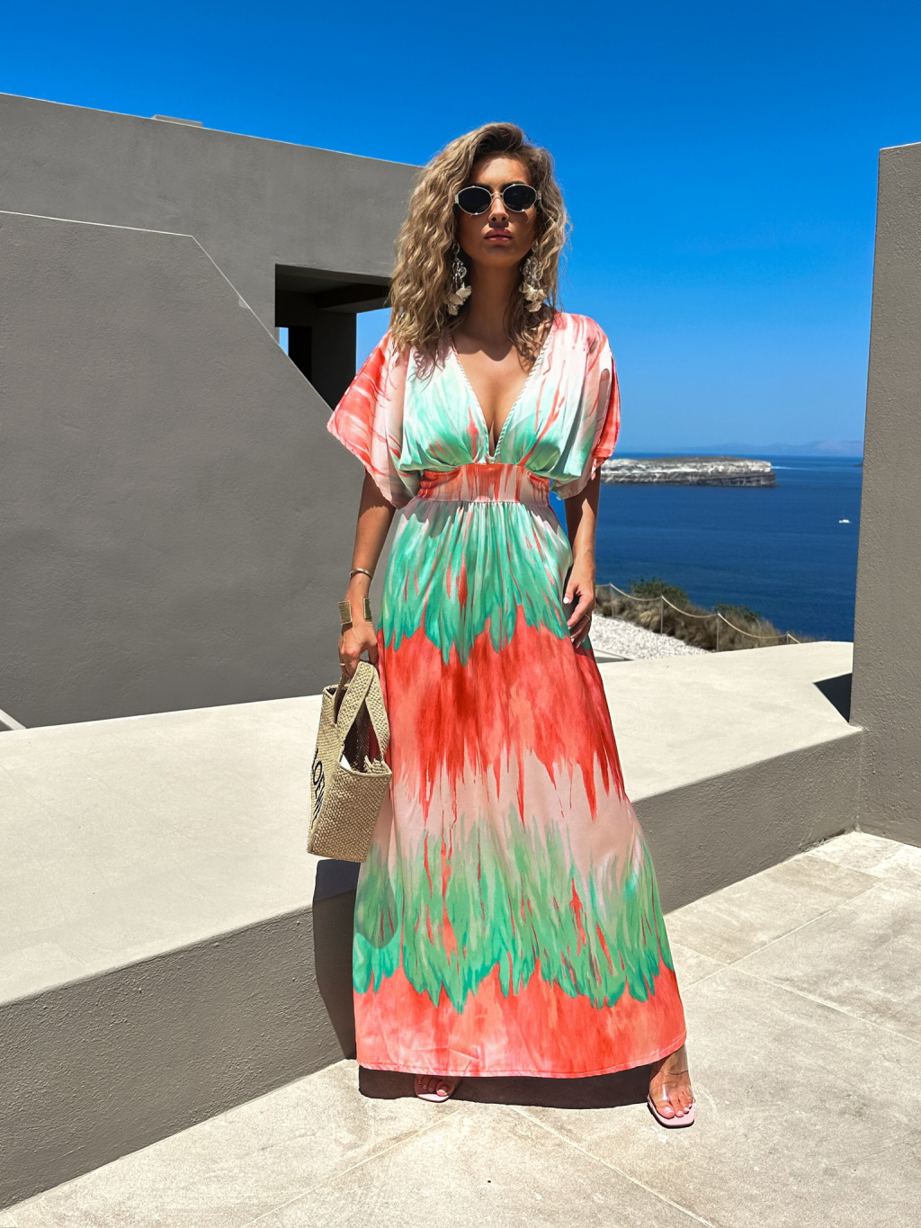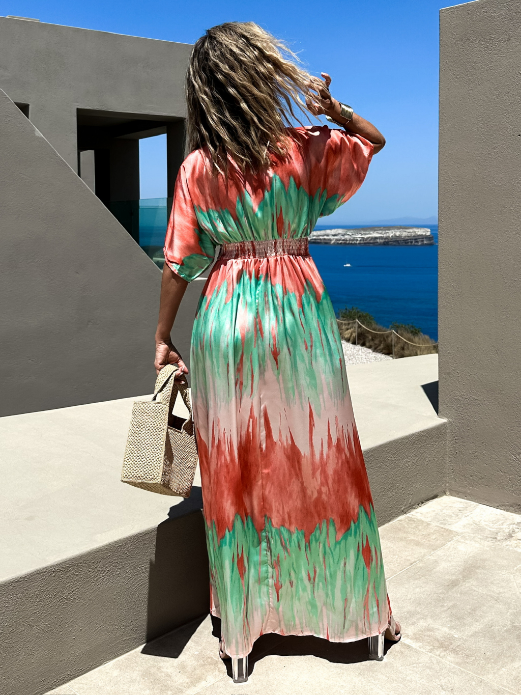 Zelenooranžové barevné dlouhé šaty DICKET s výstřihem