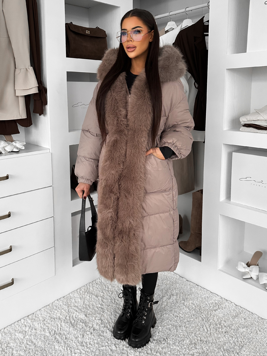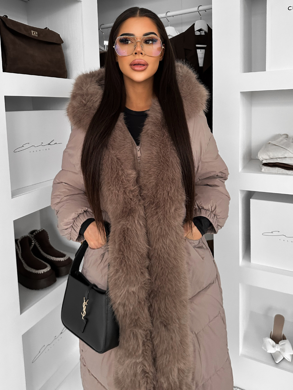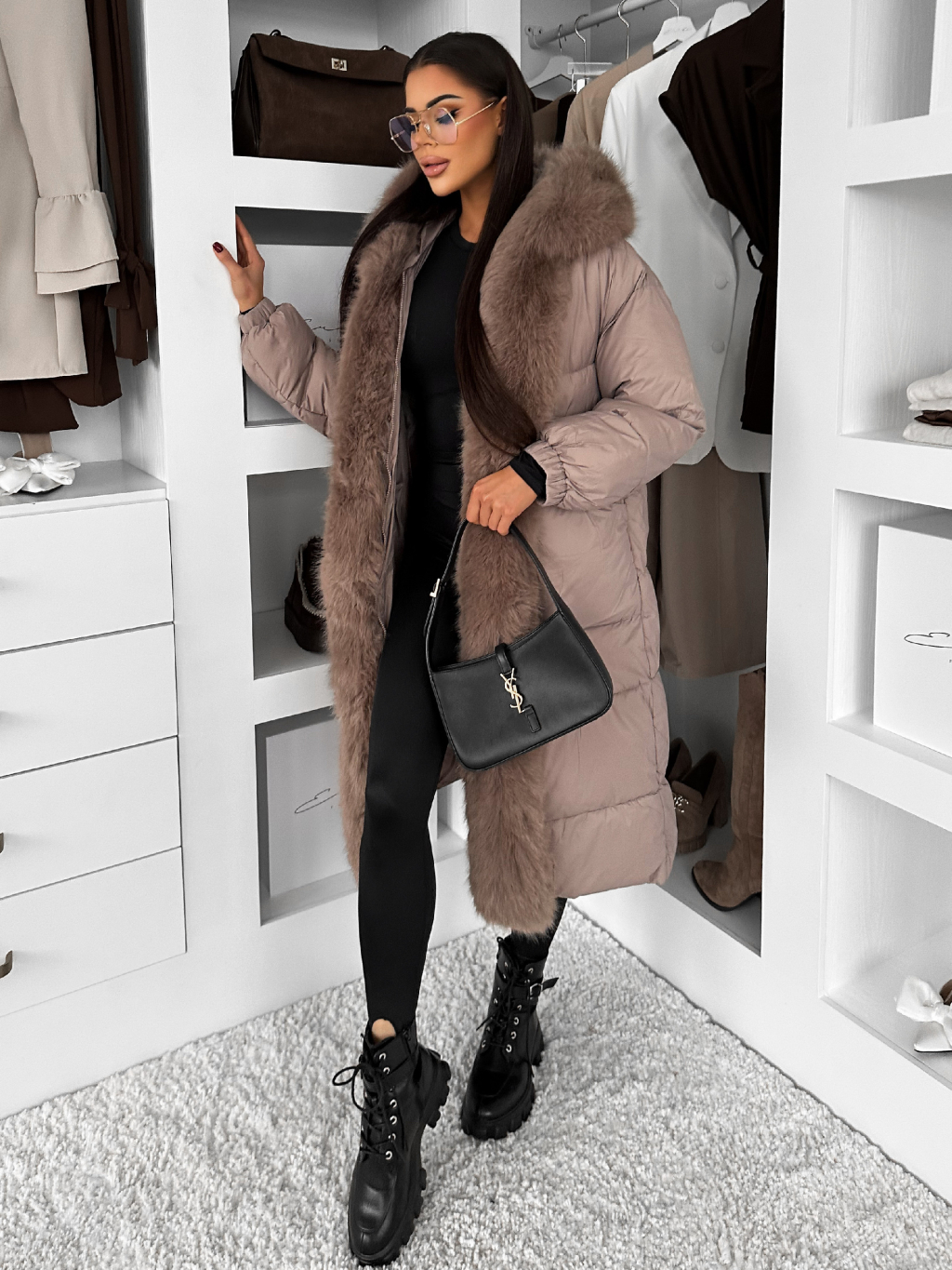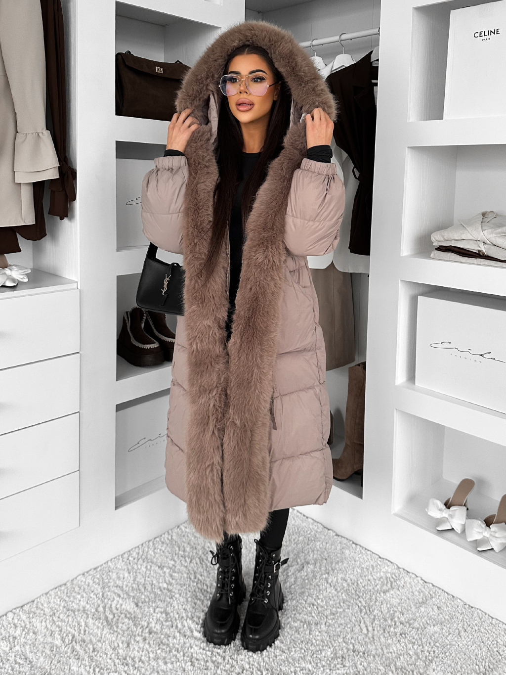 Béžová dlouhá prošívaná zimní bunda TAREVO s kožíškem