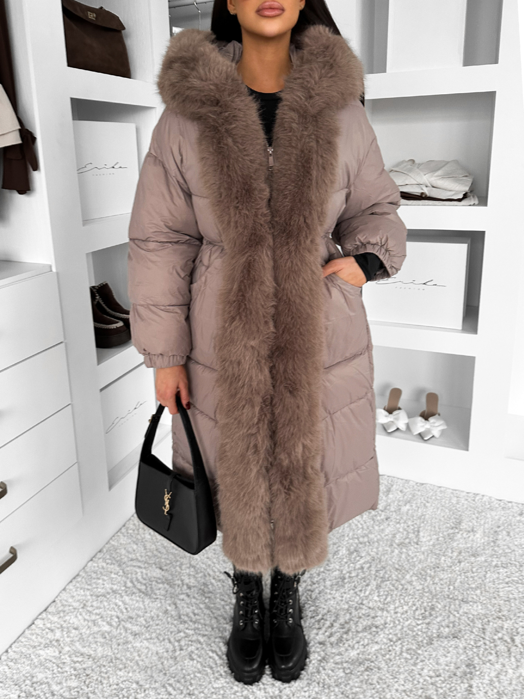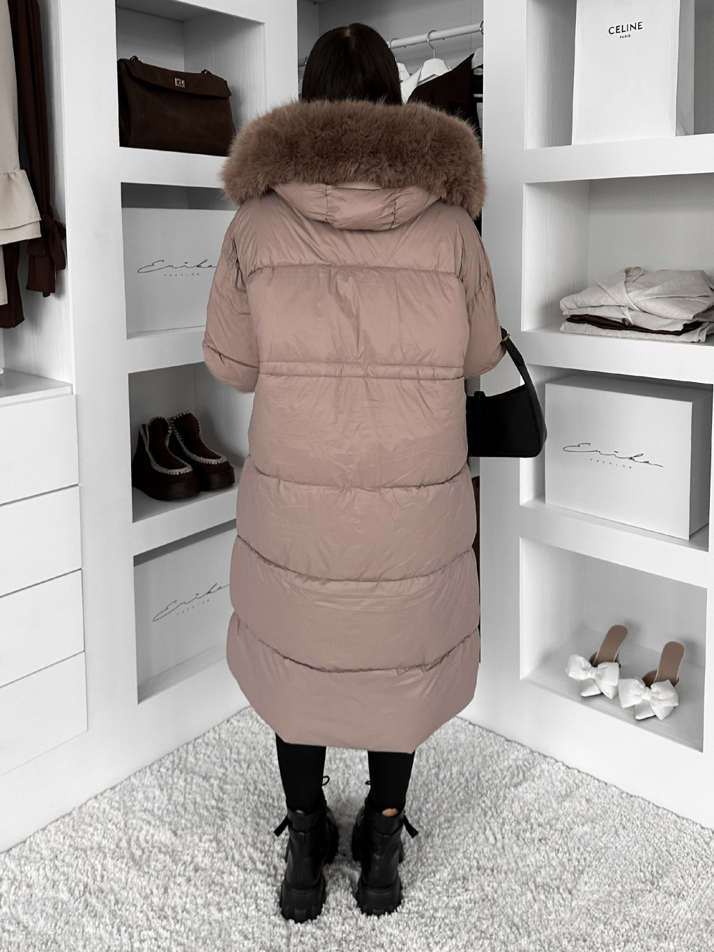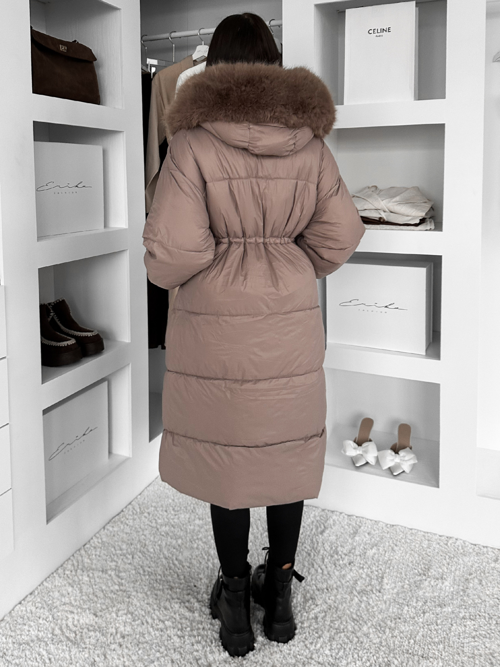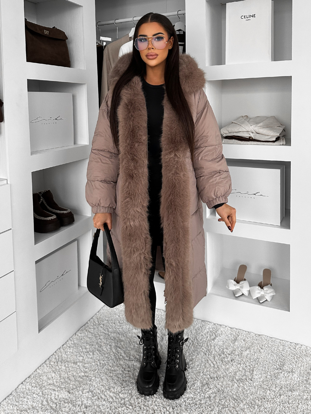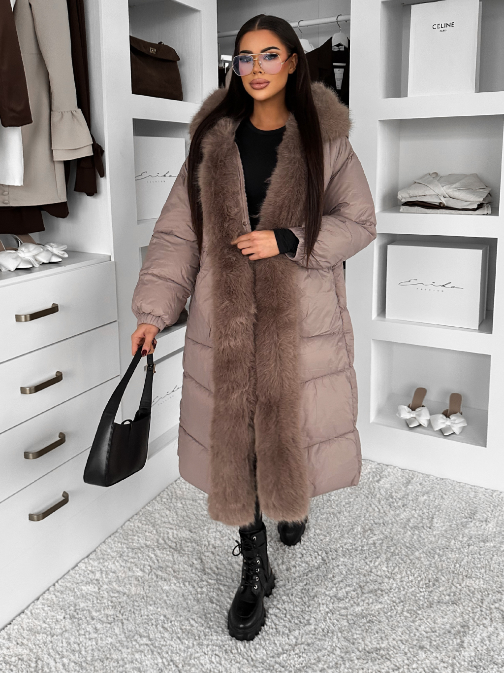 Béžová dlouhá prošívaná zimní bunda TAREVO s kožíškem