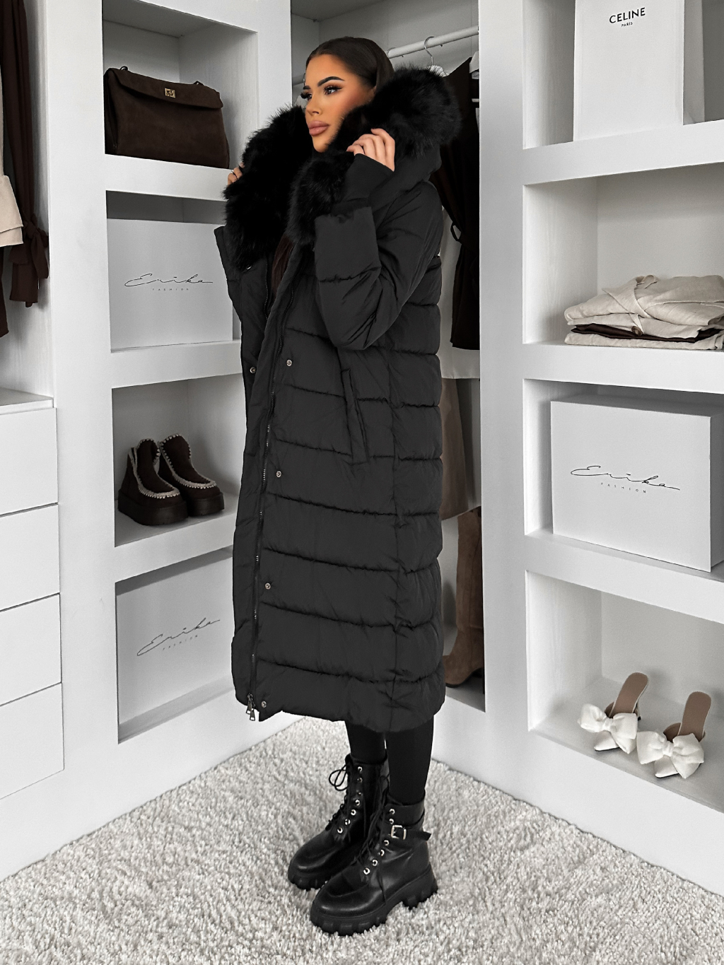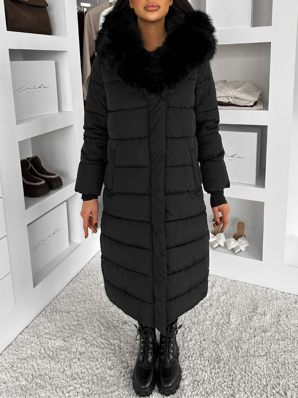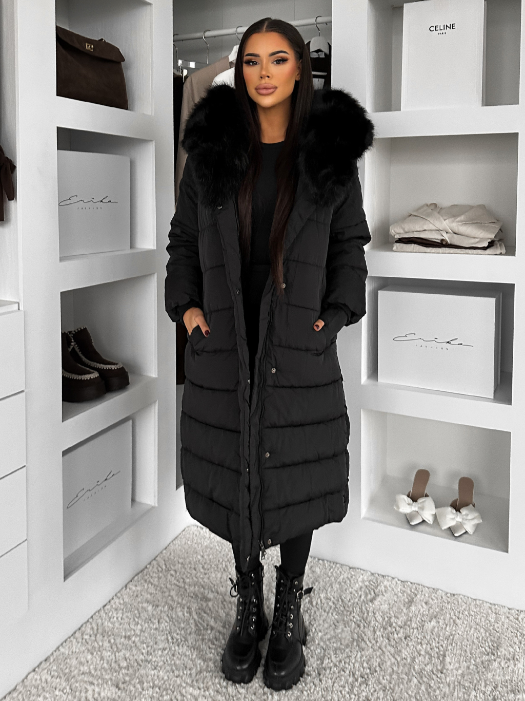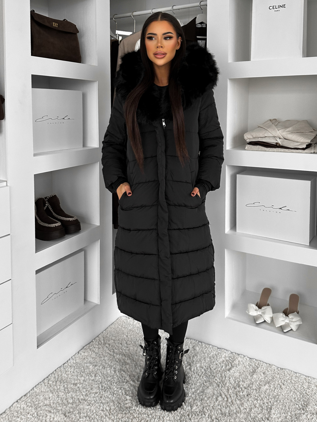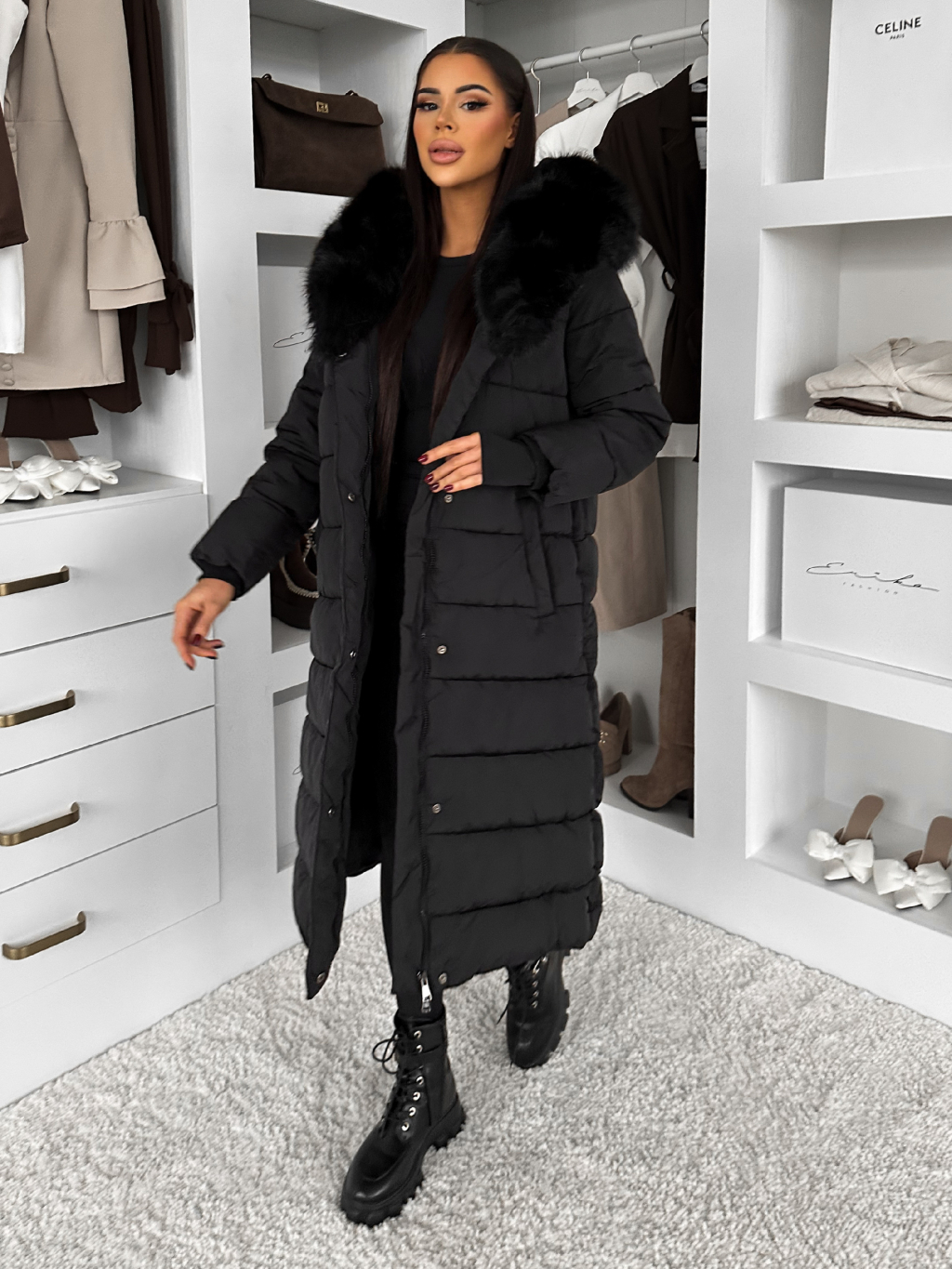 Černá dlouhá prošívaná bunda REWONA s kožíškem