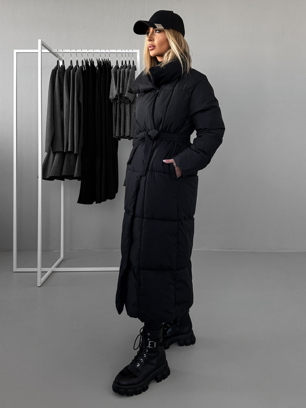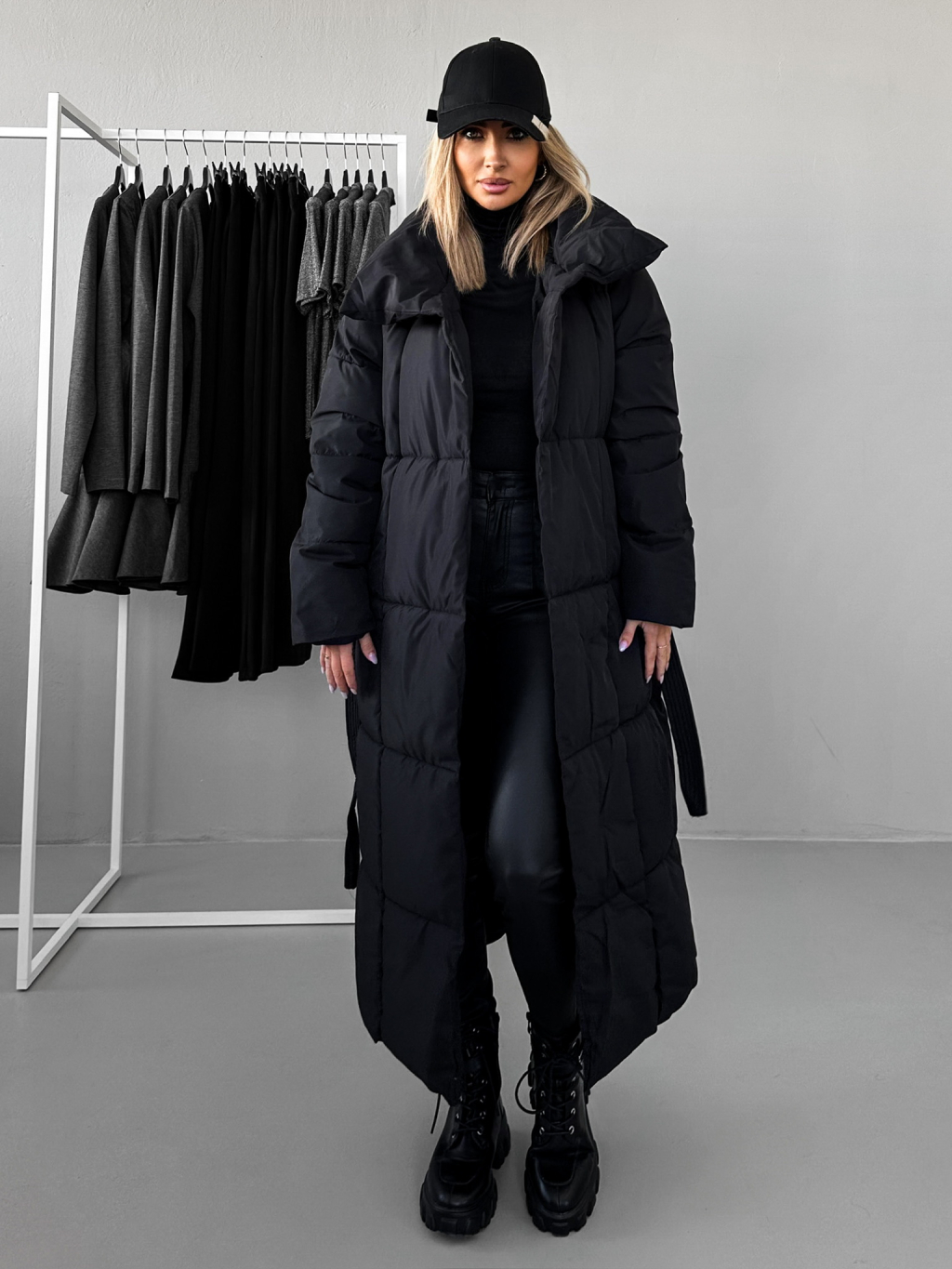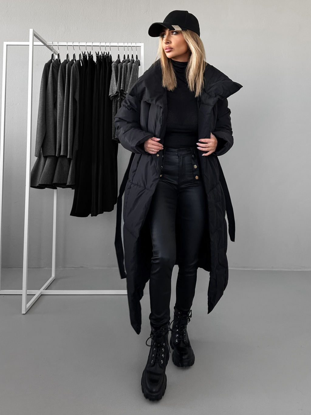 Černý dlouhý zimní prošívaný kabát ANTRONIE