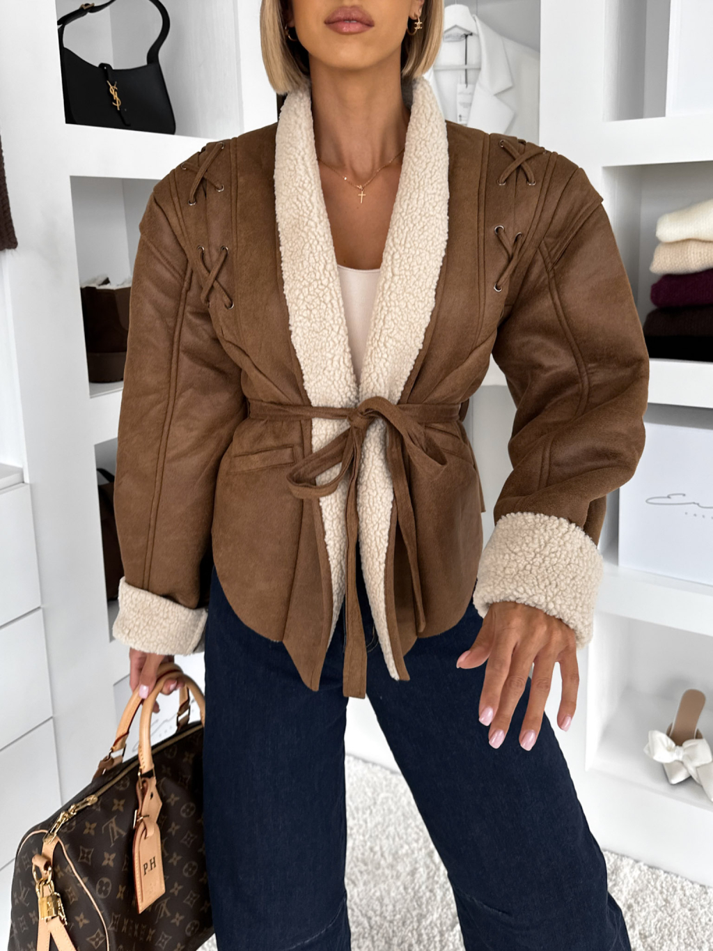 Hnědá koženková krátká bunda HRANETO s páskem