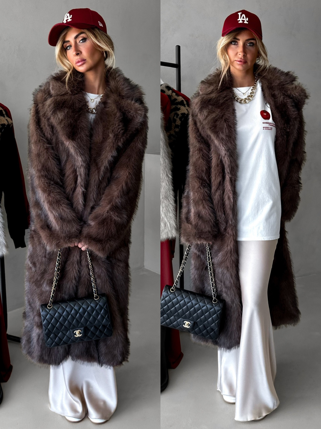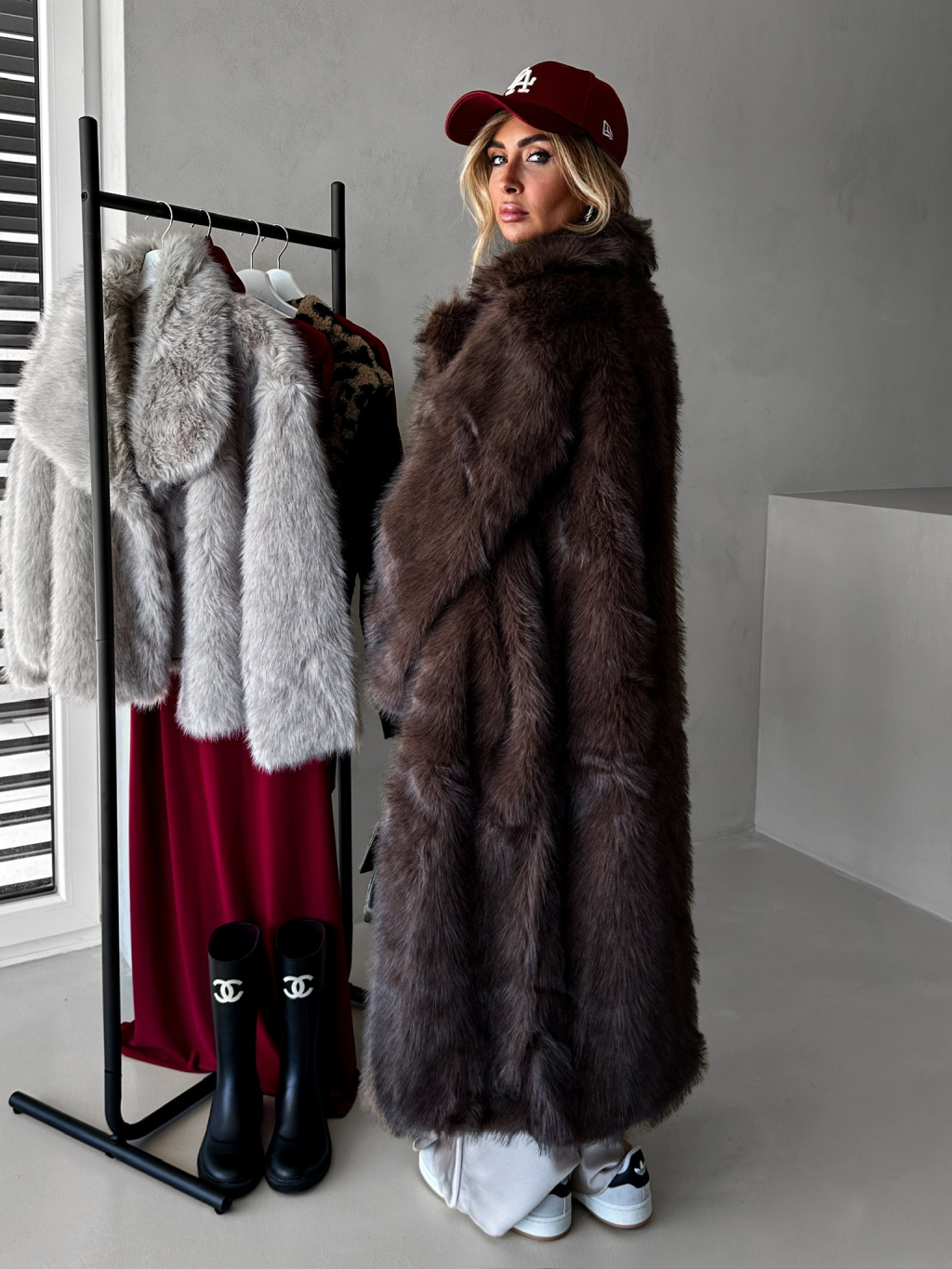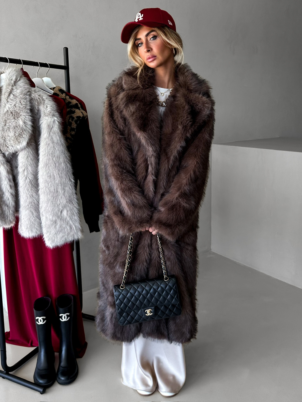 Hnědý dlouhý fauxfur kožešinový kabát KINKA