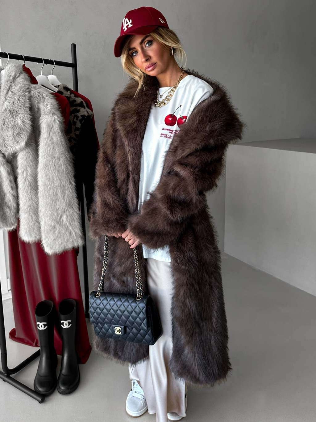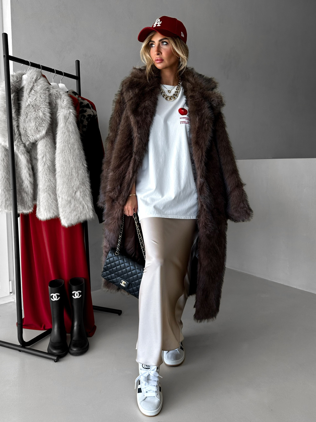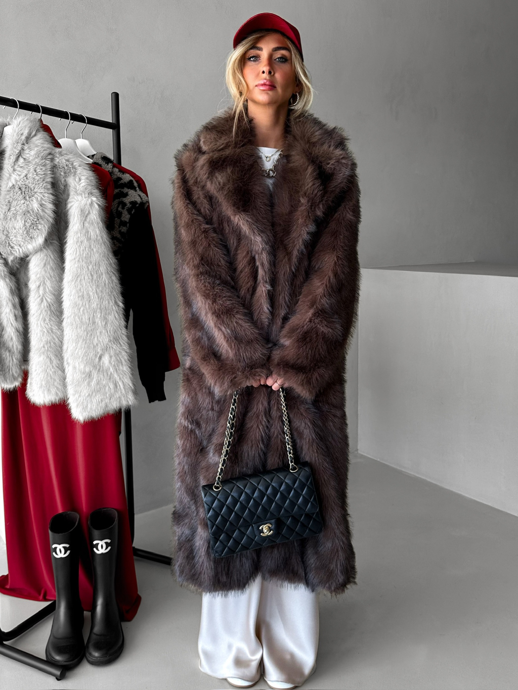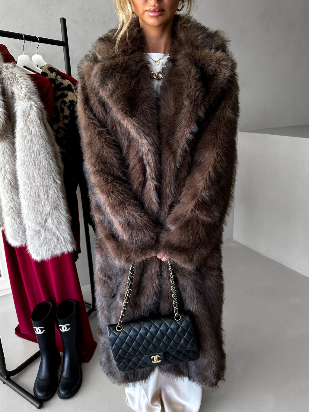 Hnědý dlouhý fauxfur kožešinový kabát KINKA
